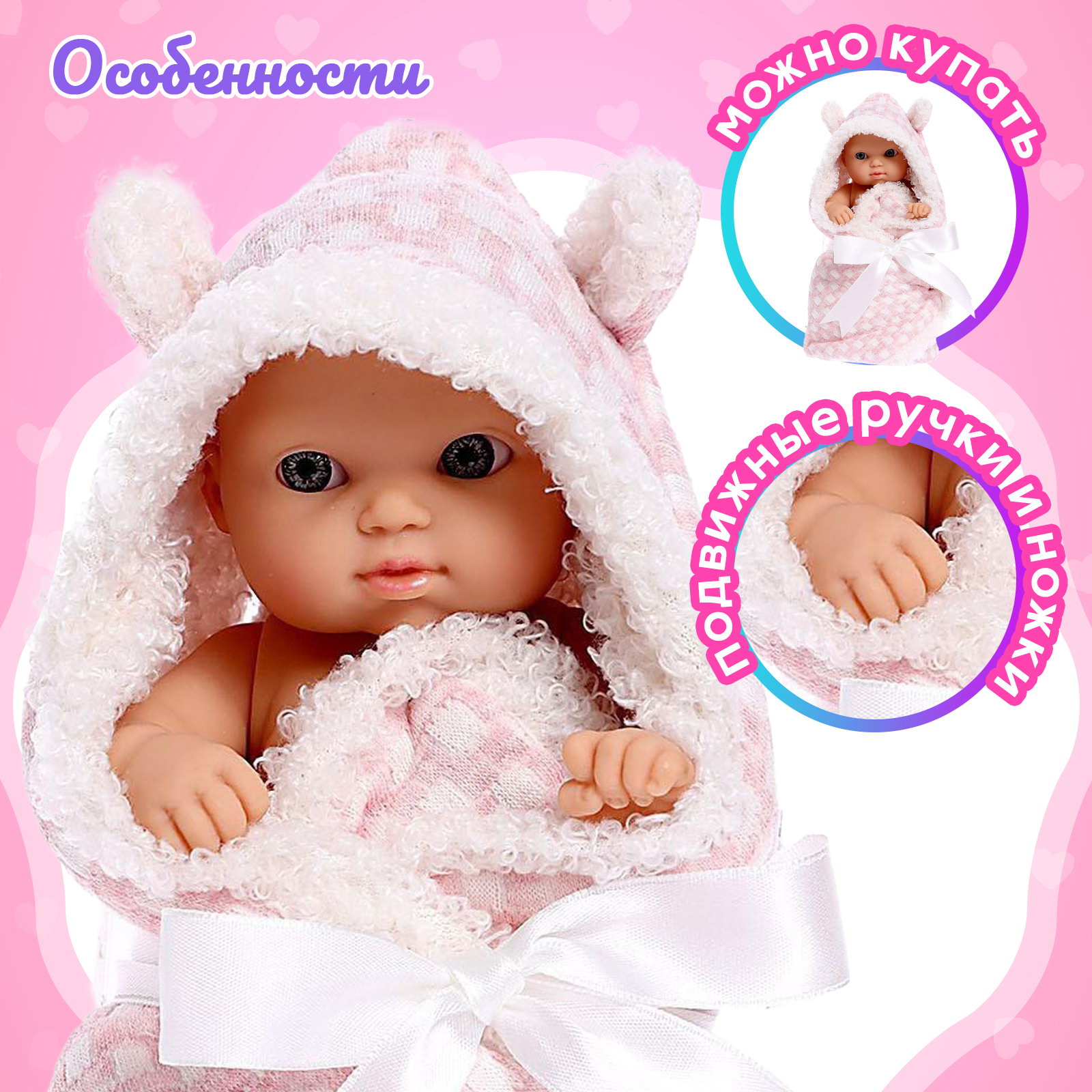 В комплект с пупсом входит мягкий конверт для пеленания. | ||