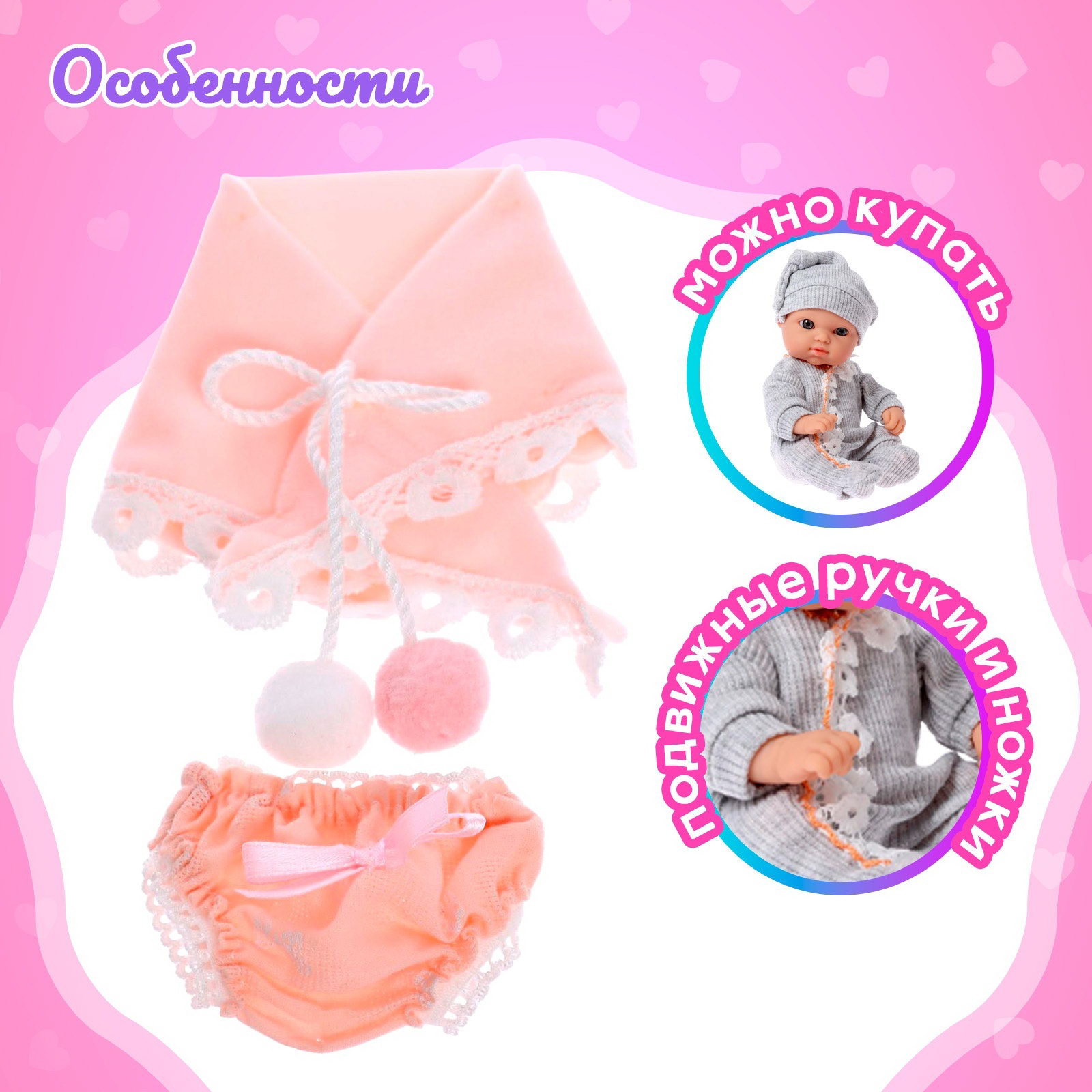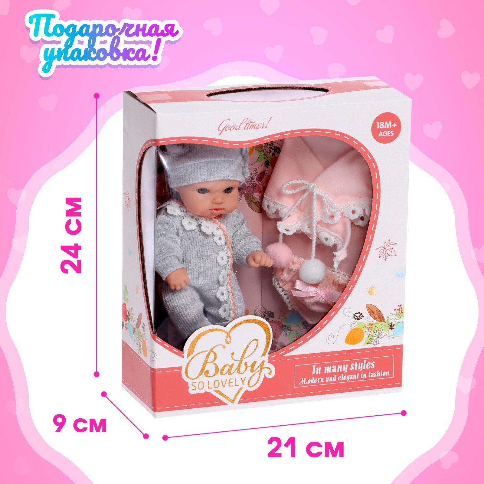 Размер упаковки: 9 x 24 x 21 см. Для кого: Для девочки Комплектация: С аксессуарами Высота, см: 18 Высота, см: 18 tnved: 9503007000 Вид упаковки: Коробка картонная с PVC Возраст: От 1.5 лет Особенности куклы: Можно купать Вид: Пупс Пупс одна из самых любимых детских игрушек. Благодаря ей малыши могут освоить социальные роли, научиться заботиться о ком-либо, проявить ответственность. Особенности пупса