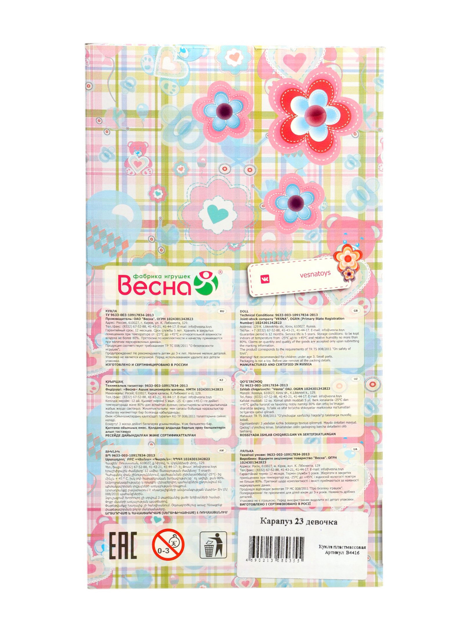 Размер упаковки: 7.5 x 24 x 13 см. tnved: 9503002000 Температурное ограничение: Нет Вид: Пупс Особенности куклы: Можно купать Возраст: От 3 лет Высота, см: 23 Для кого: Для девочки Вид упаковки: Коробка картонная Пупс "Карапуз" очаровательная игровая кукла для сюжетных и повседневных игр. Милый образ в комбинезоне с капюшоном и ушками делает пупса особенно привлекательным и легко узнаваемым для ребёнка. Пупса удобно держать в руках, сажать, ставить и переодевать. Благодаря подвижным частям тела ребёнок может разыгрывать различные ситуации ухода, прогулок и домашнего быта, развивая воображение и эмоциональную отзывчивость. Игрушка подходит для купания, что расширяет игровые возможности и делает процесс игры ещё более увлекательным и разнообразным. Особенности