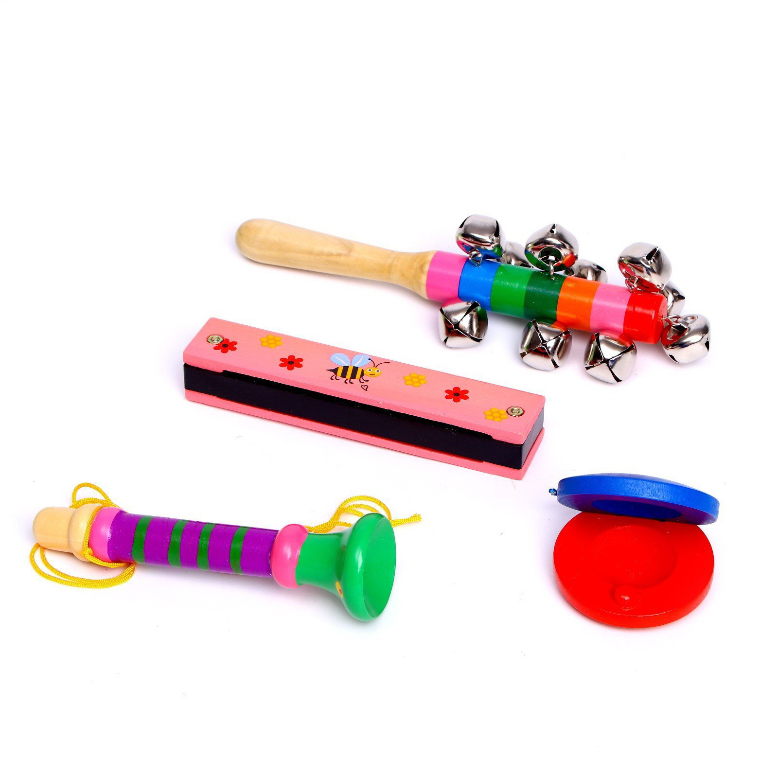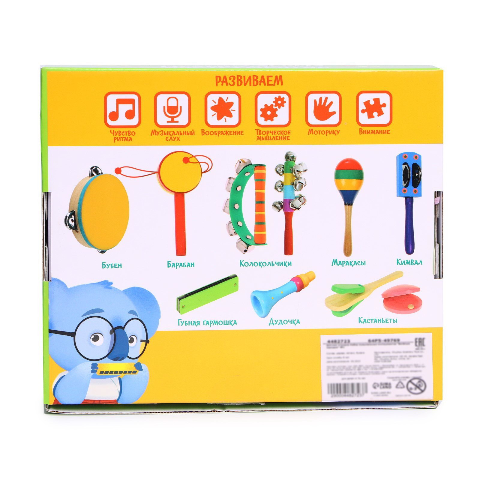 Вид инструмента: Губная гармошка, Кастаньета, Погремушка Размер упаковки: 15.5 x 5 x 18 см. Для кого: Унисекс tnved: 9503006000 Возраст: От 3 лет Развитие навыков: Музыка Дополнительные функции: Звуковые эффекты В наборе, шт.: 4 Животное восточного календаря: Кролик Тематика праздника: Новый год Цвет: Разноцветный Музыкальные инструменты играют важную роль в развитии малыша. Извлекая звуки, ребёнок начинает отличать музыкальные инструменты друг от друга, у него развивается музыкальный слух и чувство ритма. Наши деревянные инструменты абсолютно безопасны для малыша. Станут отличными проводниками в удивительный мир музыки! | ||