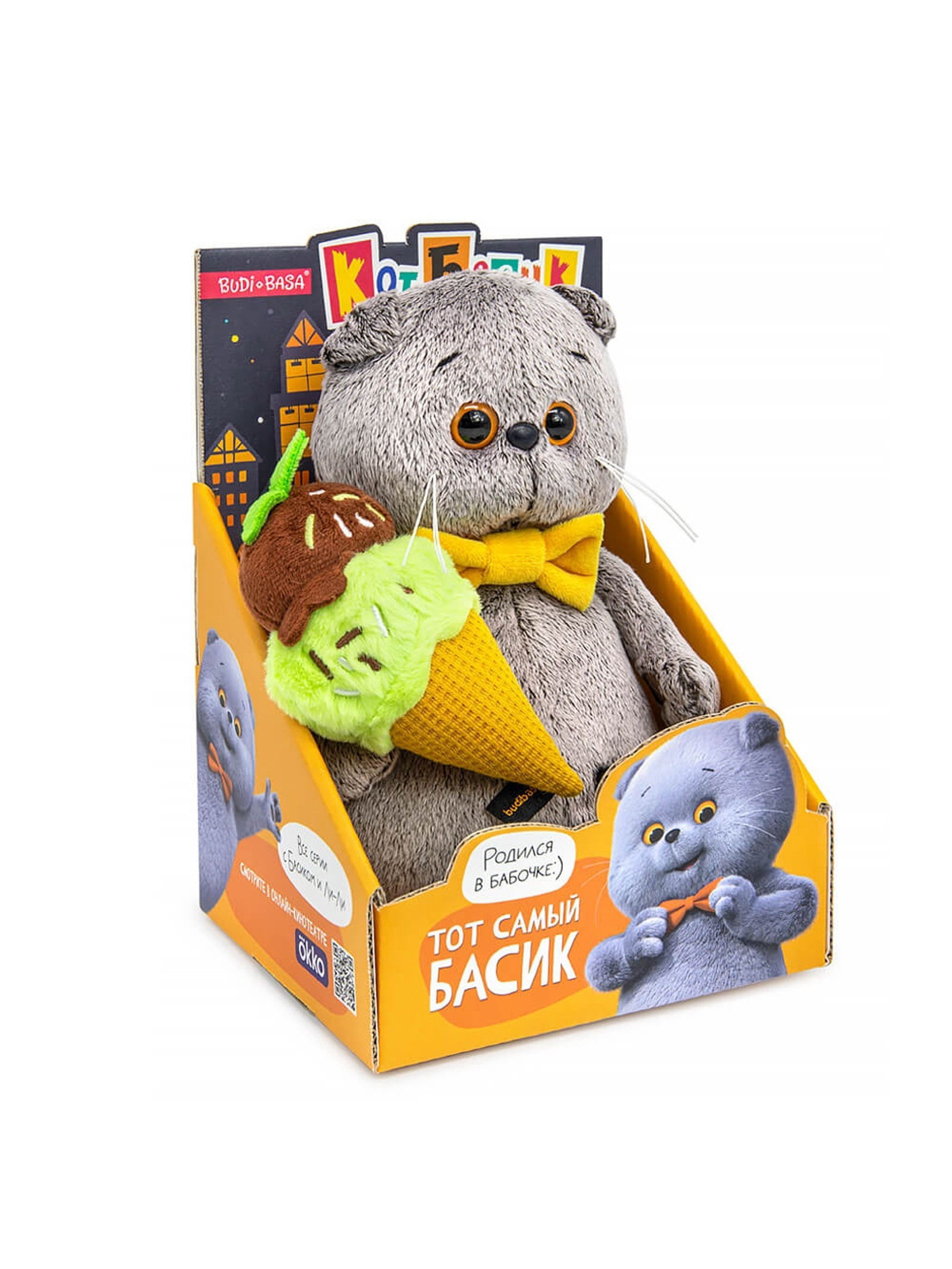 Мягкая игрушка "Кот Басик" с мороженым, 19 см, Басик и Ко, Россия