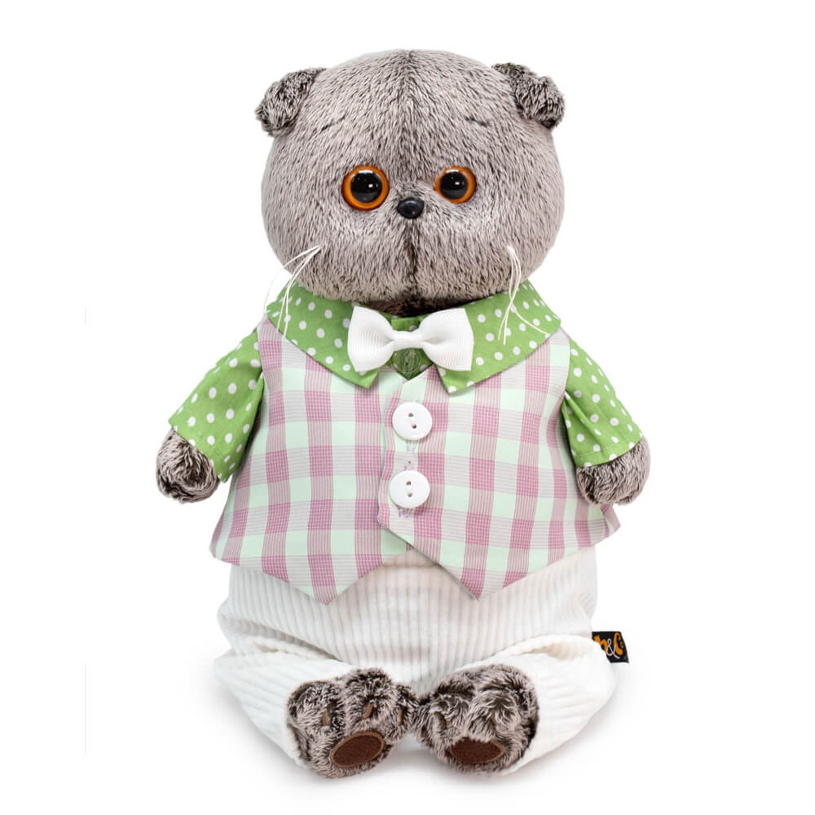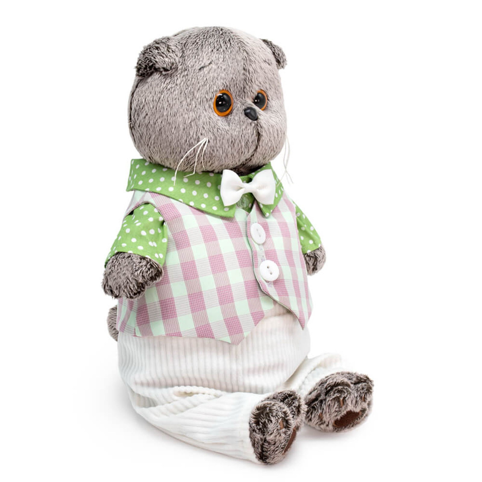 Размер упаковки: 15 x 12 x 22.5 см. tnved: 9503004000 Температурное ограничение: Нет Высота, см: 19 Вид: Кошка, кот Особенности: С одеждой Уточняющий вид: Шотландская кошка Тематика: Наземные животные Цвет: Серый Наполнитель: Синтепон Мягкая игрушка "Басик в лёгком костюме" обаятельный кот в весеннем наряде. Его образ с рубашкой в горошек, жилетом в клетку и белым бантом создан с вниманием к деталям. Басик выглядит нарядно и стильно, напоминая настоящего маленького джентльмена. Особенности