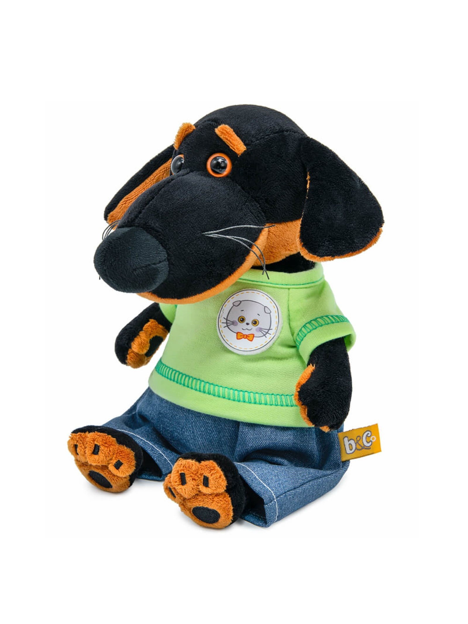 Цвет: Зелёный, Чёрный Размер упаковки: 15 x 18 x 15 см. tnved: 9503004000 Температурное ограничение: Нет Особенности: С одеждой Тематика: Наземные животные Уточняющий вид: Такса Вид: Собака Высота, см: 19 Мягкая игрушка "Собака Ваксон baby" в брючках "Деним" это милый и стильный персонаж, который сразу привлекает внимание. У игрушки мягкая плюшевая шерстка, большие ушки и выразительная мордочка, а яркая зелёная футболка и джинсовые брючки создают современный и забавный образ. Ваксон baby приятен на ощупь, легко сидит и подходит для игр, подарков и украшения детской комнаты. Особенности