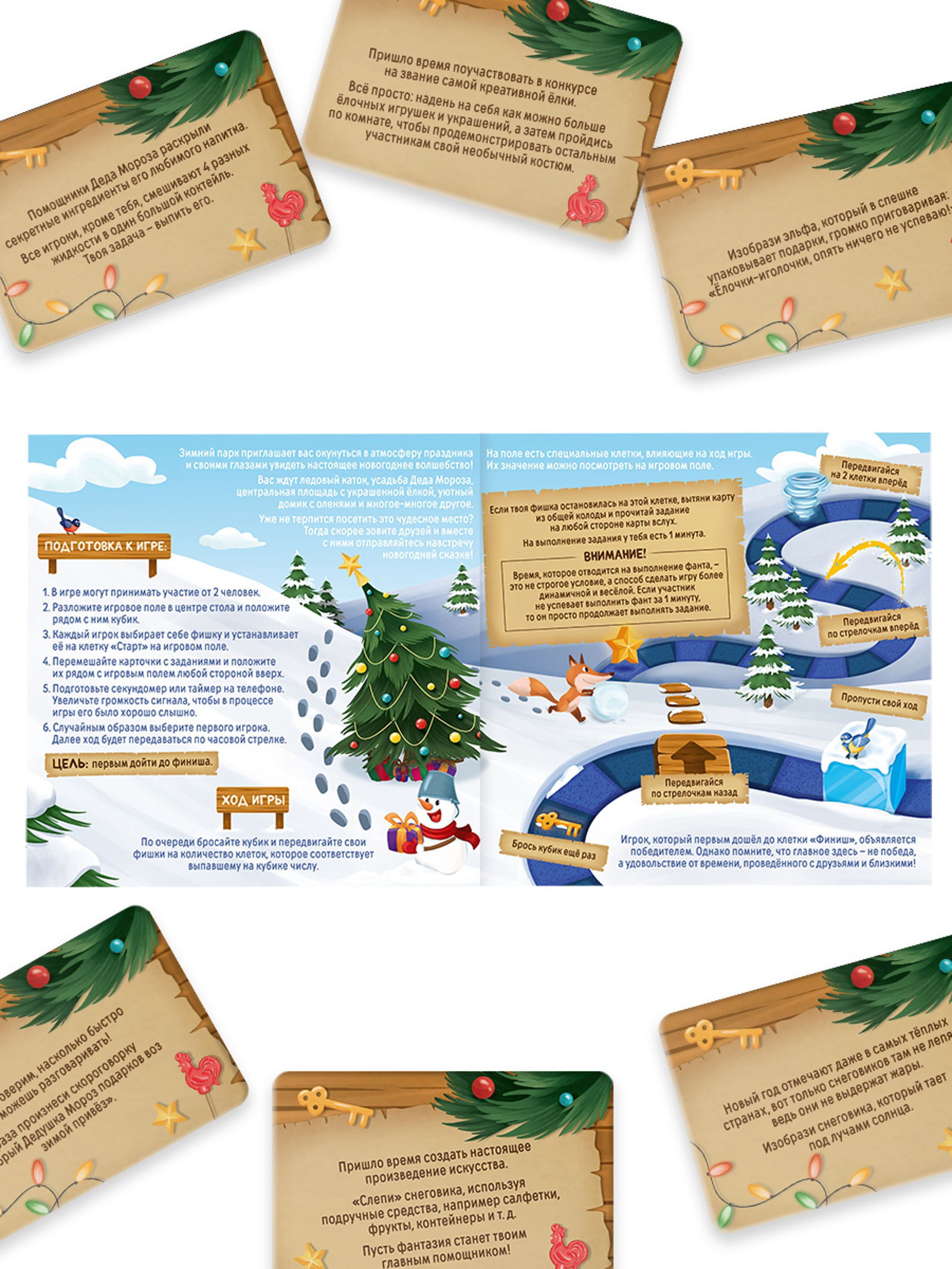 Количество игроков: [2,4], От 2 игроков Размер упаковки: 24 x 24.5 x 1 см. tnved: 9504400000 Возраст: От 5 лет Жанр игры: Бродилки Время игры: 20 минут Погрузитесь в незабываемое приключение по заснеженному парку, в котором каждая локация станет для вас волшебной дверцей в уютную зимнюю сказку! "Новогодний переполох" - настольная игра-бродилка, которая поможет вам окунуться в праздник вместе с вашими друзьями и близкими, весело провести время и насладиться уютными зимними вечерами. Как играть? По очереди бросайте кубик, передвигайте свои фишки по полю, выполняйте мини-задания на картах и приходите к финишу первым! Состав: