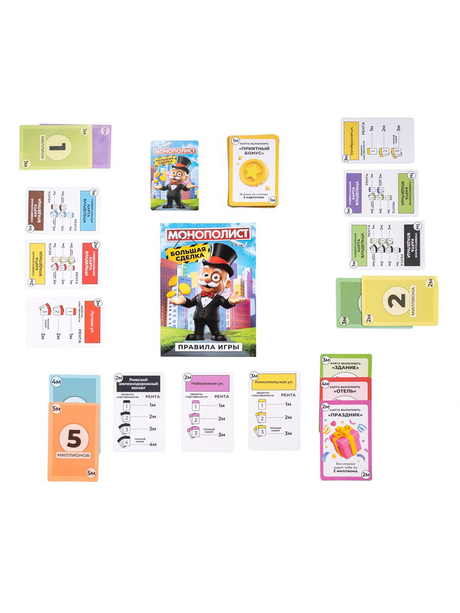 Размер упаковки: 17 x 4 x 12 см. tnved: 9504908000 Температурное ограничение: Нет Количество игроков: [2,6] Возраст: От 8 лет Жанр игры: Стратегическая Сделай ход, который меняет всё. Экономическая настольная игра "Монополист: Большая сделка" это динамичная стратегия про деньги, сделки и риск. Здесь каждый участник примеряет на себя роль предпринимателя: покупает, торгуется, просчитывает и иногда идёт ва-банк ради победы.