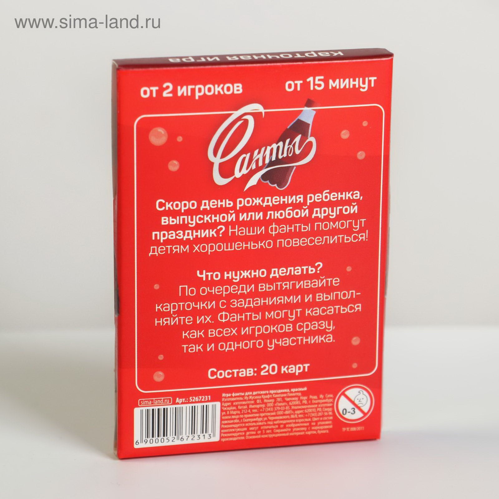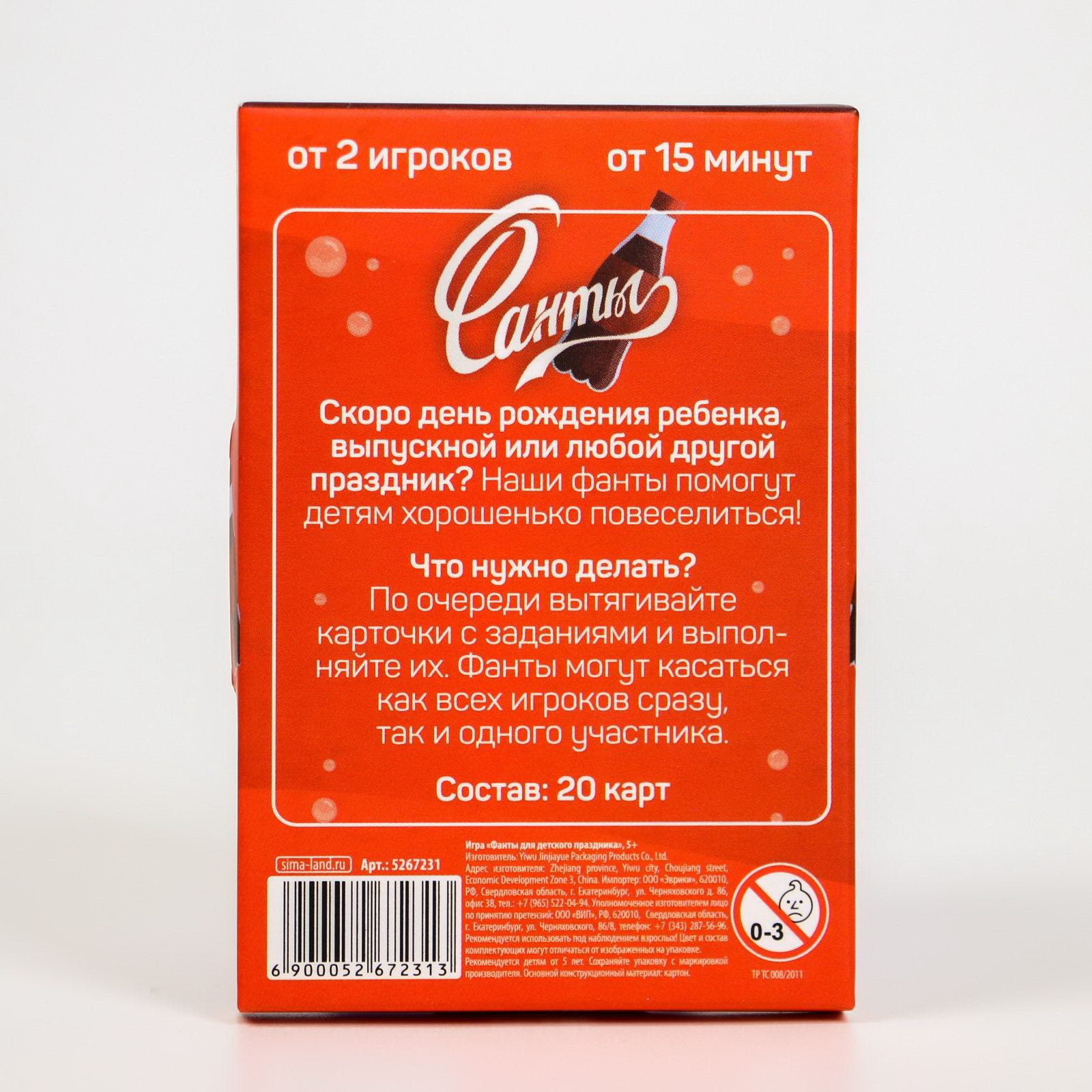 Повод для игры: Детский праздник, Праздник Жанр игры: Коммуникативная, Фанты и подвижные Количество игроков: 2 - 4 игрока, 4 - 6 игроков, 6 и более, [2,6] Размер упаковки: 6.5 x 9.5 x 1 см. Размер упаковки: 6.5 x 9.5 x 1 см. tnved: 9504908000 Возраст: От 5 лет Медиагалерея: Без медиа Тематика праздника: Универсальная тематика Фанты для детского праздника Скоро день рождения ребёнка, выпускной или другой праздник? Наши фанты помогут детям потанцевать, посоревноваться друг с другом, проявить творческие способности и хорошенько повеселиться! Что нужно делать? По очереди вытягивайте карточки, зачитывайте задания и выполняйте их. Фанты могут касаться как всех игроков сразу, так и одного участника. Внутри вы найдёте 20 карточек | ||