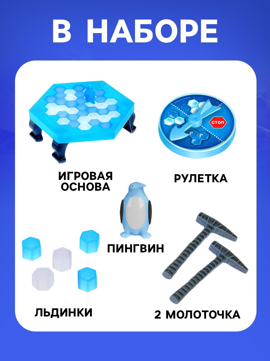 Размер упаковки: 3.5 x 15.5 x 16 см. Количество игроков: [2,4] Жанр игры: 3D-Action Возраст: От 4 лет Время игры: 15 минут Развитие навыков: Ловкость Игрушка с видео: Да Для кого: Унисекс tnved: 9504908000 "Чья льдина крепче" настольная игра для детей от 4 лет. Сюжет перенесёт ребёнка в увлекательную экспедицию по Антарктиде. Обитатели холодного континента милые и дружелюбные зверята, которым не терпится познакомиться с малышом. Маленькому исследователю предстоит аккуратно взять пробу льда, не побеспокоив греющегося пингвина. Цель игры Разбить льдинку, не уронив пингвина. Как играть