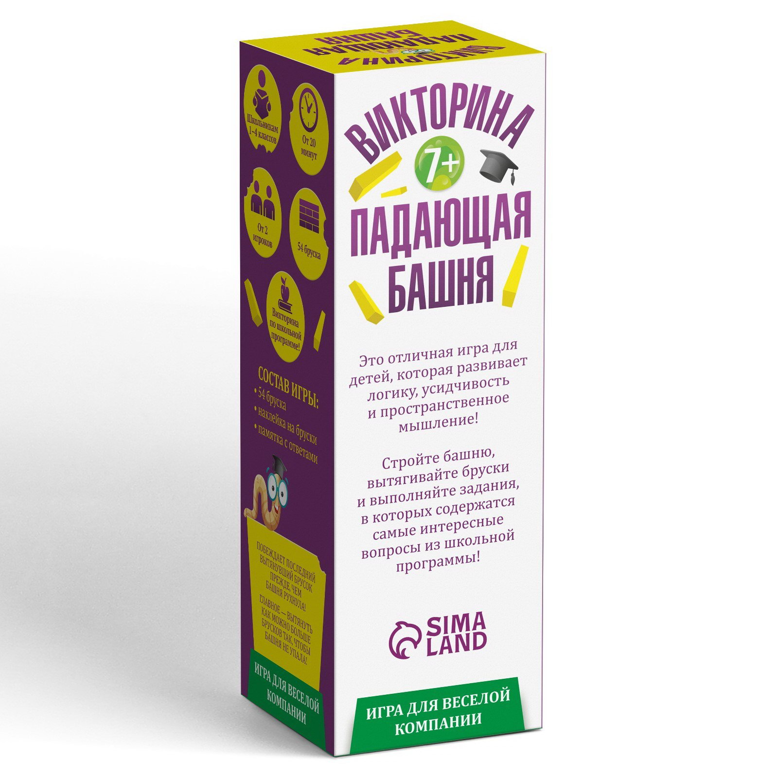 Жанр игры: Викторины, Развивающая, Семейная Количество игроков: [2,6], От 2 игроков Развитие навыков: Внимание, Координация, Кругозор Размер упаковки: 6.8 x 20.5 x 7 см. Тема обучения: Окружающий мир Время игры: 20 минут Возраст: От 7 лет tnved: 9504908000 Медиагалерея: Без медиа Вид: Игры на ловкость Для кого: Унисекс Количество элементов: 54 Это отличная игра для детей, которая развивает логику, усидчивость и пространственное мышление! Как играть?