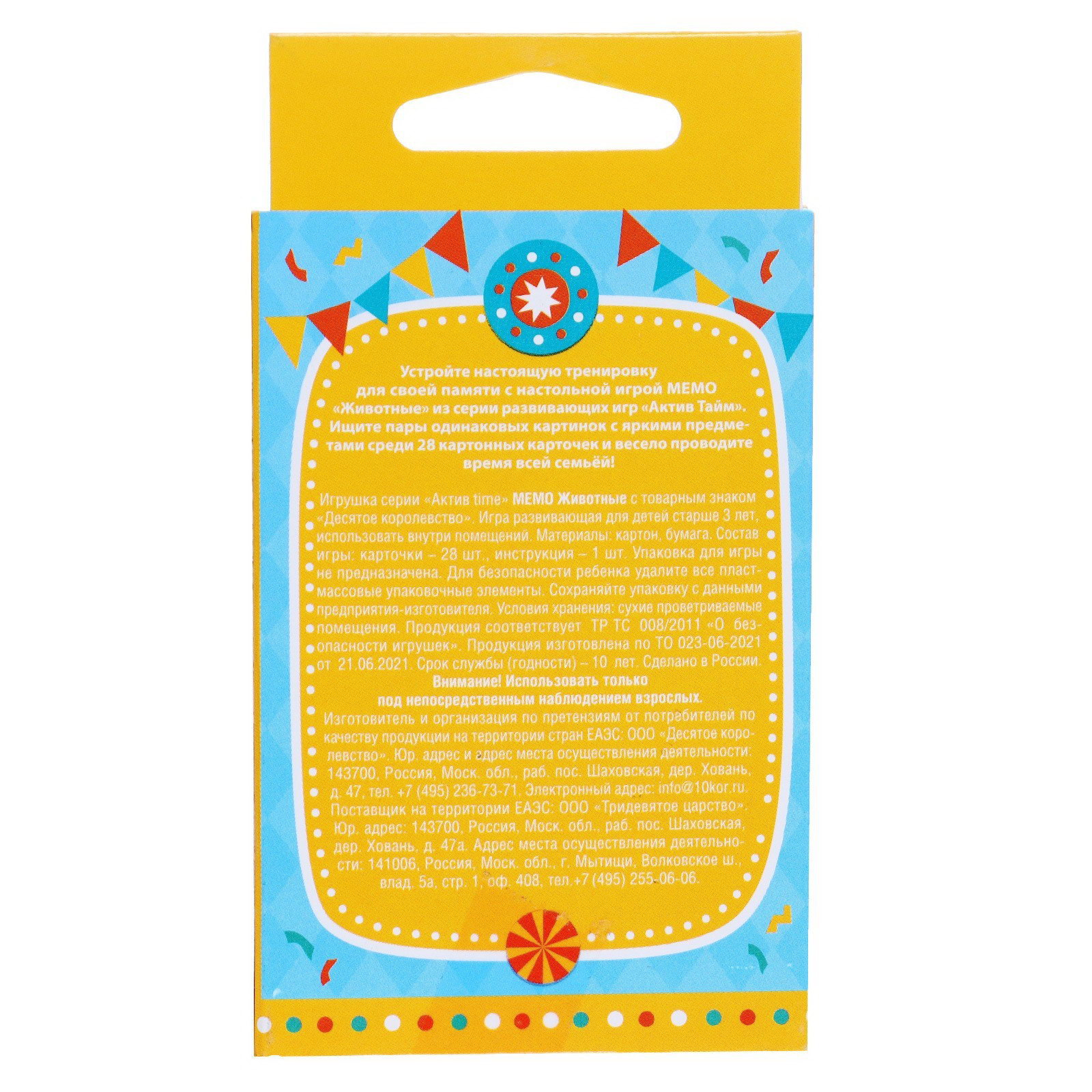 Размер упаковки: 6 x 1 x 11 см. tnved: 9504808000 Температурное ограничение: Нет Развитие навыков: Память Возраст: От 3 лет Жанр игры: На память Количество игроков: [2,4] | ||