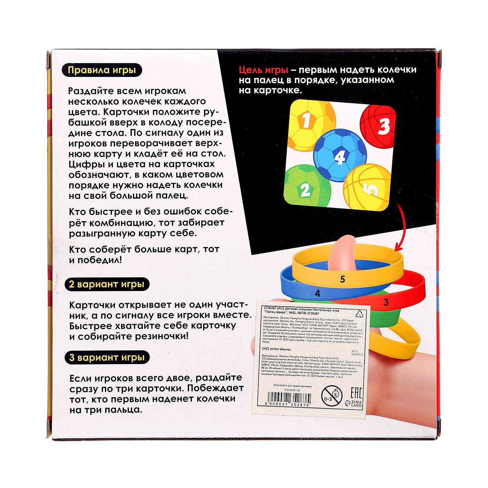 Развитие навыков: Воображение, Моторика, Фигуры, цвета Размер упаковки: 4 x 17 x 17 см. Количество игроков: [1,6] Возраст: От 3 лет Жанр игры: Фанты и подвижные Игрушка с видео: Да Для кого: Унисекс Для кого: Унисекс tnved: 9504908000 Цель игры – первым надеть колечки на палец в том порядке, который указан на выпавшей карточке. Перетасуйте карточки, раздайте каждому игроку по одной рубашкой вверх, а остальные положите в колоду посередине стола. По команде игроки переворачивают свою карту и начинают собирать колечки на палец в порядке, который с помощью картинок и цифр указан на карте. Кто первым выполнит задание – тот и выигрывает раунд. Сыграйте несколько раундов и определите победителя! | ||