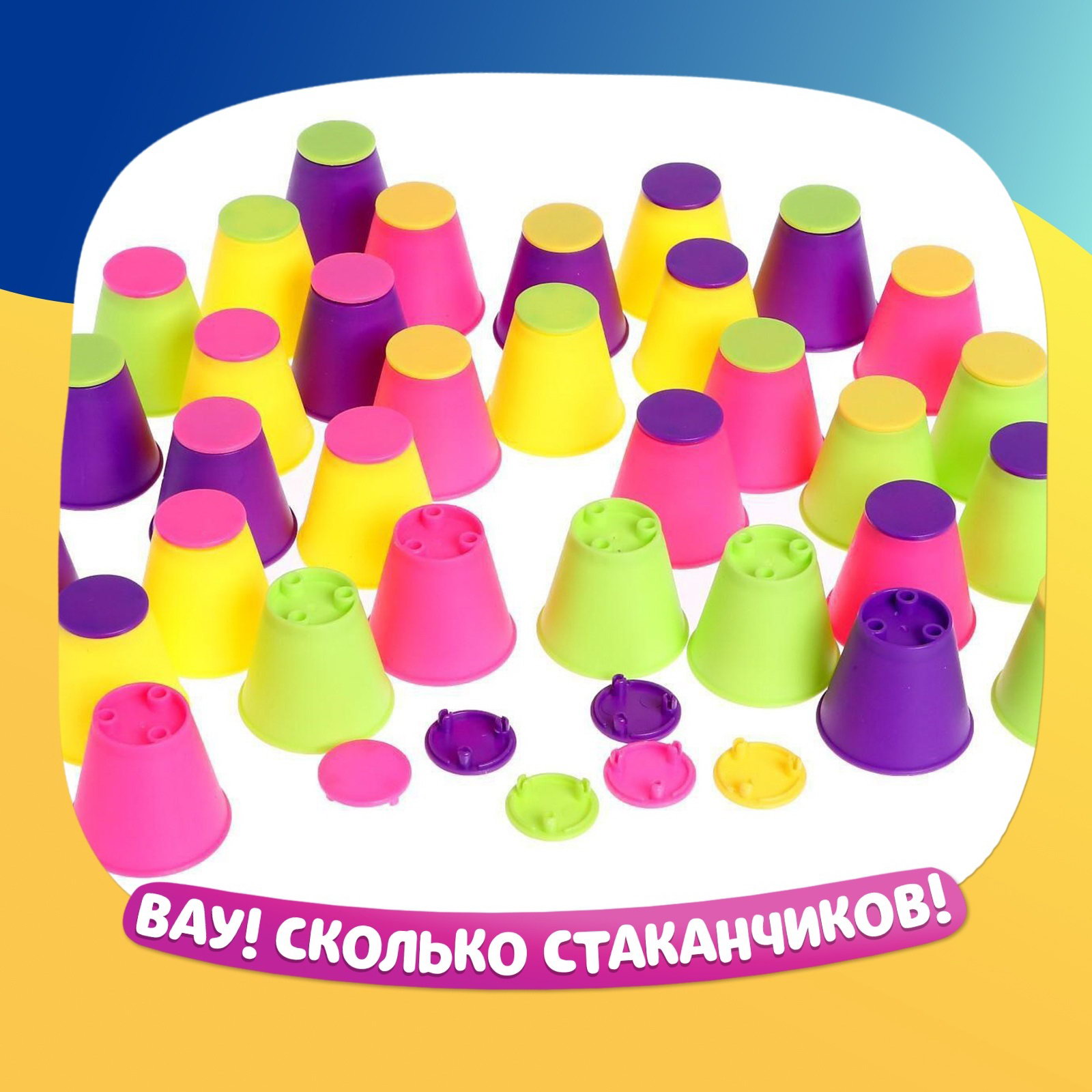 Варианты игры Предусмотрено несколько вариантов игры для самых озорных непосед! Игра "Наоборот" Игра по стандартным правилам, но стаканчики нужно ставить так, чтобы донышко каждого следующего стаканчика совпадало по цвету с предыдущим стаканчиком, а не дном. Игра-стратегия