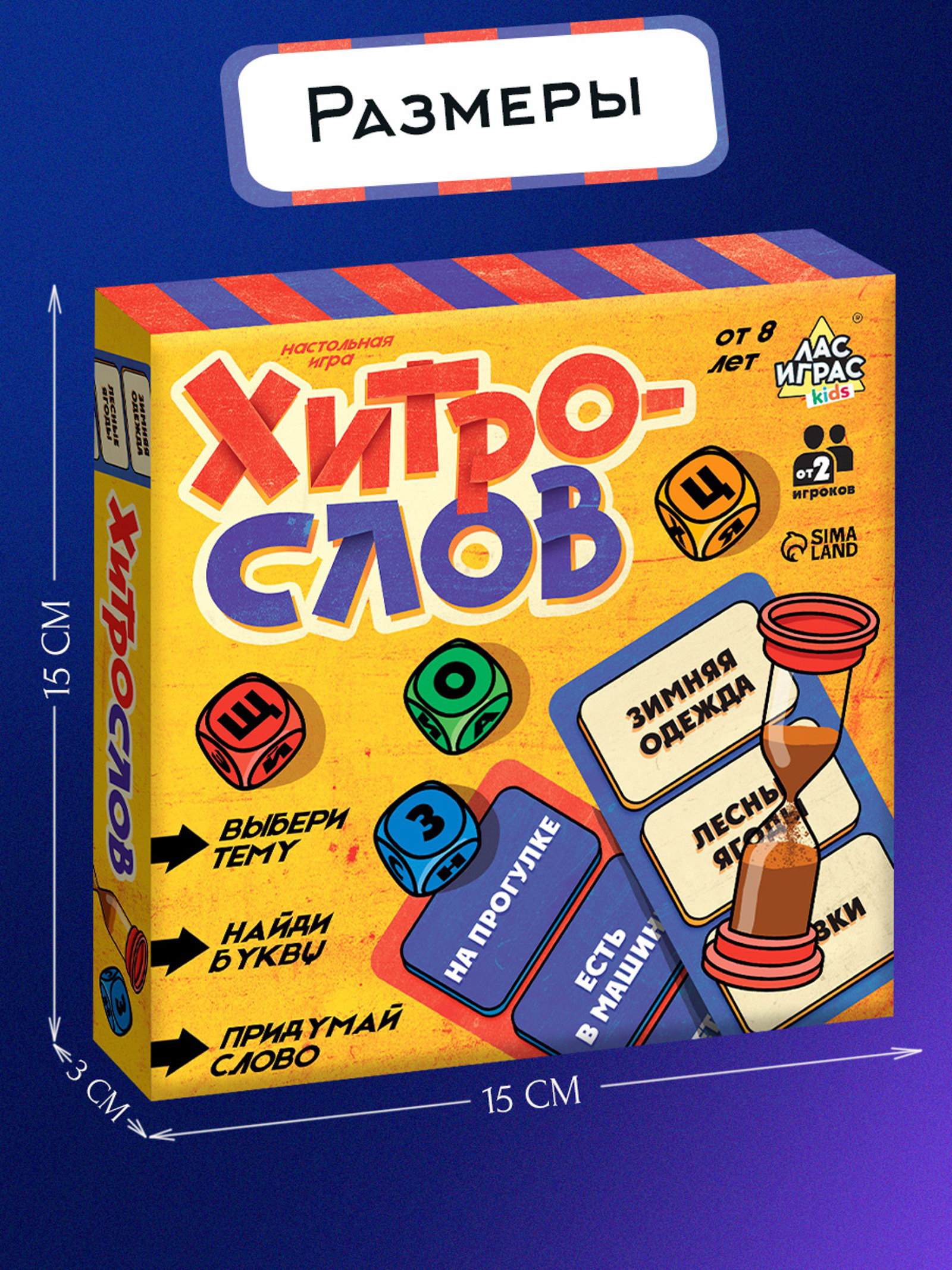 Развитие навыков: Грамматика, Логика, Чтение Жанр игры: Семейная, Словесная и числовая Размер упаковки: 3 x 15 x 15 см. Игрушка с видео: Да Для кого: Унисекс Для кого: Унисекс tnved: 9504400000 Возраст: От 8 лет Количество игроков: [2,99] Время игры: Не ограничено "Хитрослов" необычная настольная игра на составление слов. Вам предстоит придумывать слова на заданные темы, но так, чтобы в них некоторые буквы были на строго определённом месте! Подготовка к игре