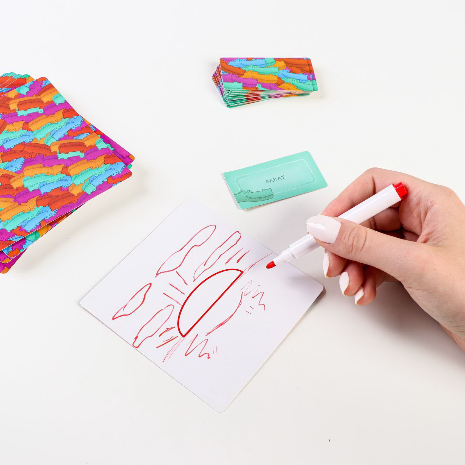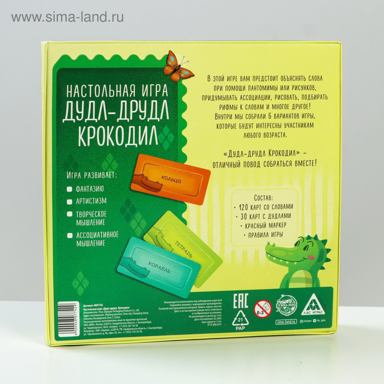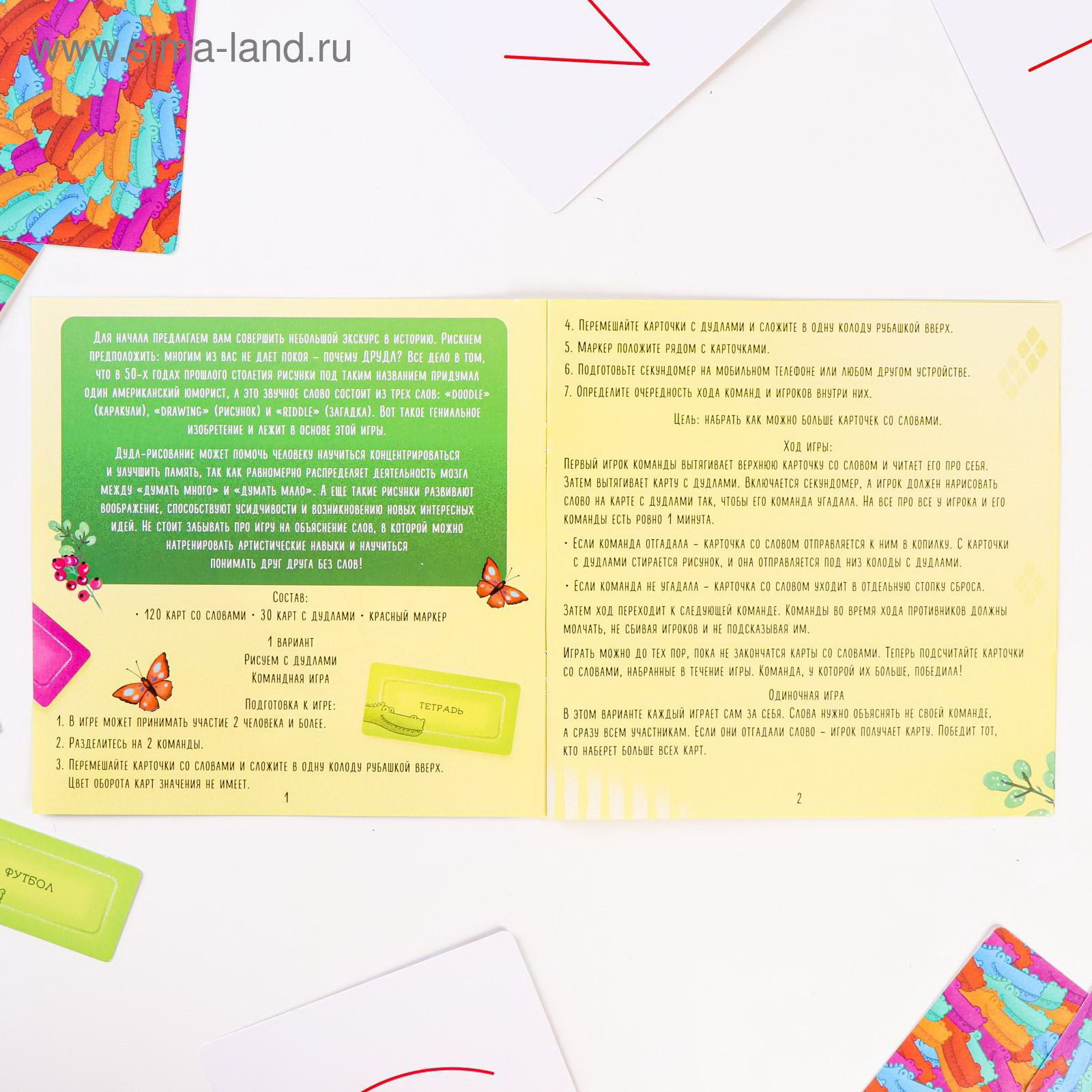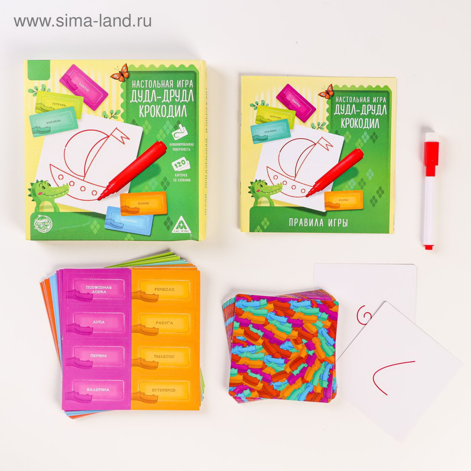Победит команда, которая набрала больше всего карточек со словами! Также можно играть в формате "Каждый сам за себя" и объяснять слова всем игрокам сразу. 2-й вариант: рисовалки Этот вариант игры проходит по тем же правилам, что и предыдущий, только нужно подготовить листы бумаги и пишущие предметы. Можно взять маркер, имеющийся в комплекте. Используйте только карточки со словами. Задача игроков объяснять слова с помощью рисунка на бумаге. Этот вариант немного легче, так как рисовать можно как угодно, не опираясь на готовый друдл. Играть можно как командами, так и каждый сам за себя. 3-й вариант: крокодил Так можно играть командами или каждый сам за себя, понадобятся только карточки со словами. По очереди вытягивайте карты и на время объясняйте с помощью мимики и жестов слова так, чтобы остальные угадали. На всё про всё есть ровно 1 минута. Помните, что во время объяснения нельзя произносить какие-либо слова и указывать на предметы, находящиеся рядом. Победит тот, кто наберёт больше всего карточек! Ещё больше вариантов игры вас ждёт в правилах. Скорее собирайтесь всей семьёй или друзьями и начинайте играть! Игра развивает