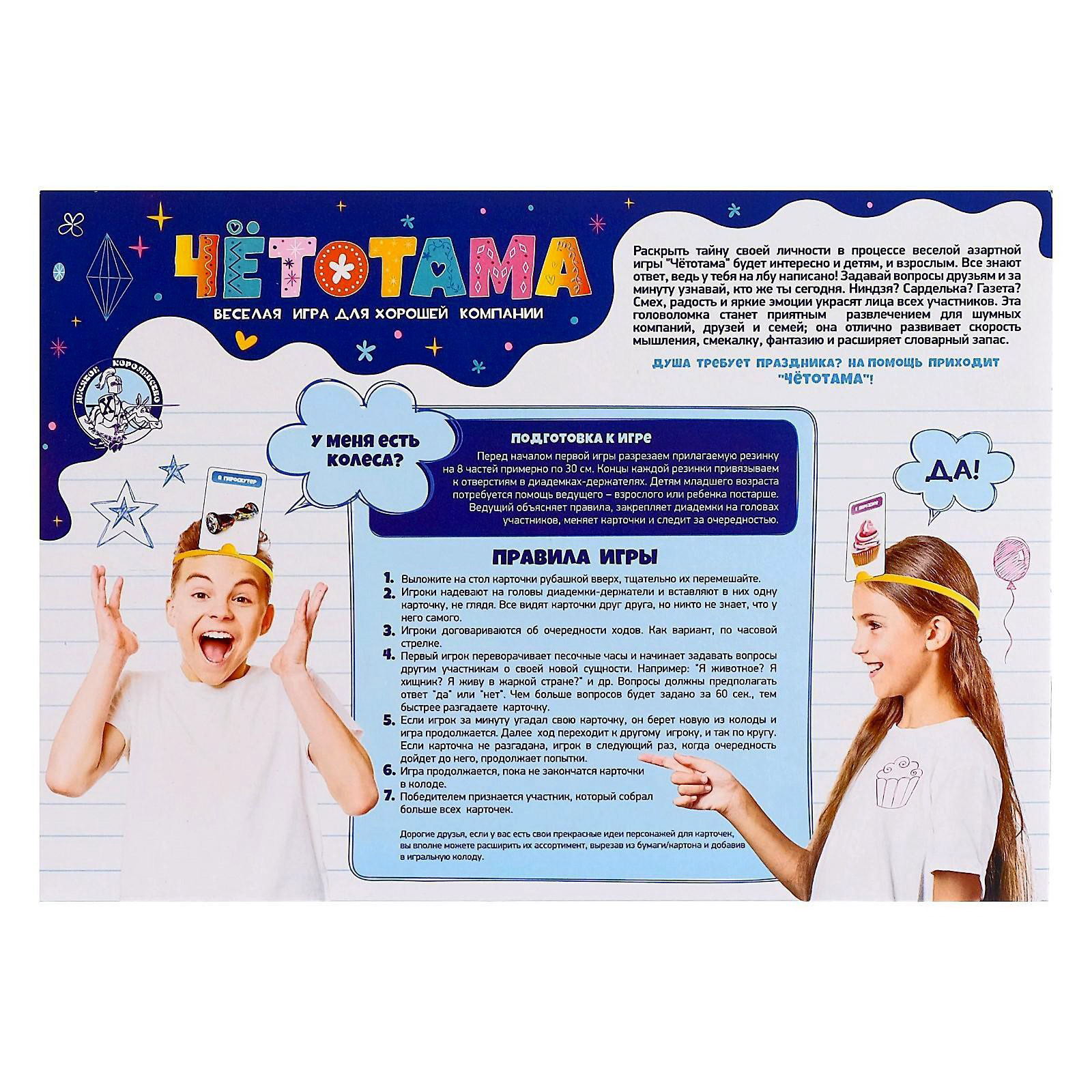 Жанр игры: Коммуникативная, Семейная Размер упаковки: 28 x 20 x 4.5 см. Для кого: Унисекс tnved: 9503010000 tnved: 9503010000 Температурное ограничение: Нет Количество игроков: [2,4] Возраст: От 7 лет Со множеством современных гаджетов живое общение с родственниками и друзьями всё больше отходит на задний план. Но как же здорово увлечённо поиграть или вспомнить детство в весёлой и шумной компании! Игра настольная "Тарантинки. Чётотама" поможет собрать вместе родственников и друзей, отложить в сторону все устройства и прекрасно провести досуг. У нас вы найдёте игры для людей разных возрастов и с разными предпочтениями. | ||
