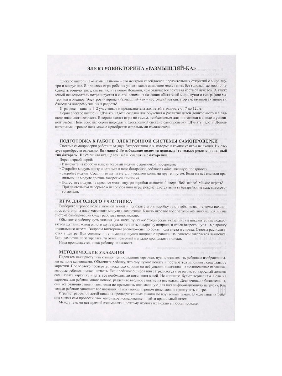 Размер упаковки: 24 x 4 x 37 см. Для кого: Унисекс tnved: 9503007000 Температурное ограничение: Нет Жанр игры: Викторины Развитие навыков: Логика Возраст: От 5 лет Электронная викторина "Размышляй-ка" это увлекательная игра, которая поможет детям узнать больше о окружающем нас мире. С помощью 240 вопросов и 8 тематических разделов ребёнок расширит кругозор, разовьёт логику и память. Особенности
