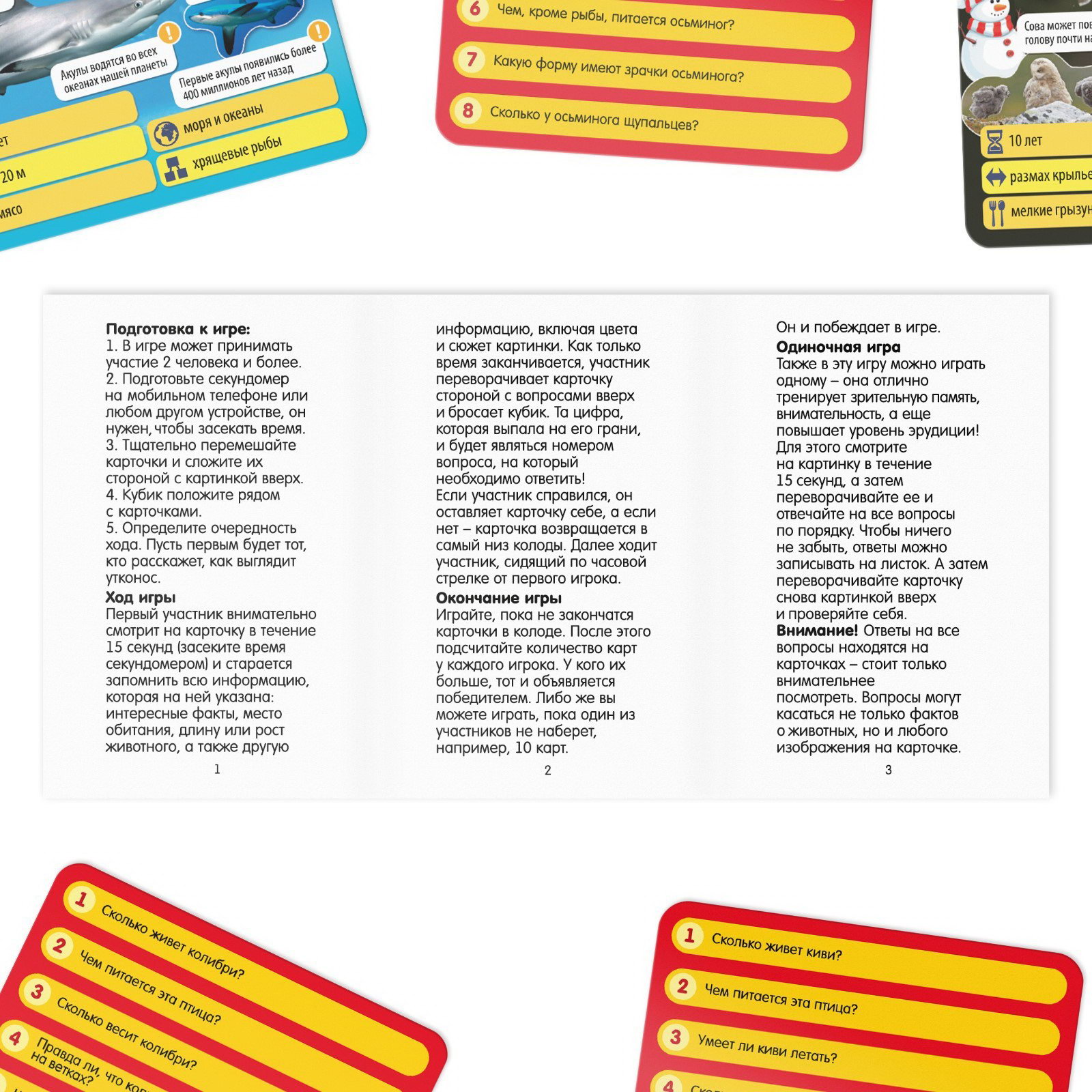 Количество игроков: [1,5], От 1 игрока Развитие навыков: Внимание, Кругозор, Память Жанр игры: Викторины, Развивающая, Семейная Размер упаковки: 9.5 x 2 x 12.3 см. Тема обучения: Окружающий мир Возраст: От 7 лет Для кого: Унисекс Время игры: 10 минут Время игры: 10 минут tnved: 9504400000 Медиагалерея: Без медиа Возрастная категория: 7+ Количество карточек: 50 Вид: Карточки с заданиями Узнай за 15 секунд! В мире столько разных животных! Эта познавательная игра поможет вам познакомиться с различными зверями, рыбами, птицами и насекомыми, а также узнать про них много новой и интересной информации. Вам предстоит смотреть на карточки, запоминать изображение и текст, написанный на них. А потом отвечать на занимательные вопросы! Новое открытие на каждой карточке В наборе вы найдёте 50 карточек. На них находятся фотографичные изображения животных, а также информация о них: место обитания и интересные факты. Изучив карточку в течение 15 секунд, бросьте кубик. Цифра укажет номер вопроса. Все вопросы находятся на обороте и относятся не только к числам и фактам, но ещё и к самому изображению на карточках. Игрок, верно ответивший на вопрос, забирает карточку себе. Побеждает, разумеется, самый внимательный участник, набравший больше всего карт! В набор входит: