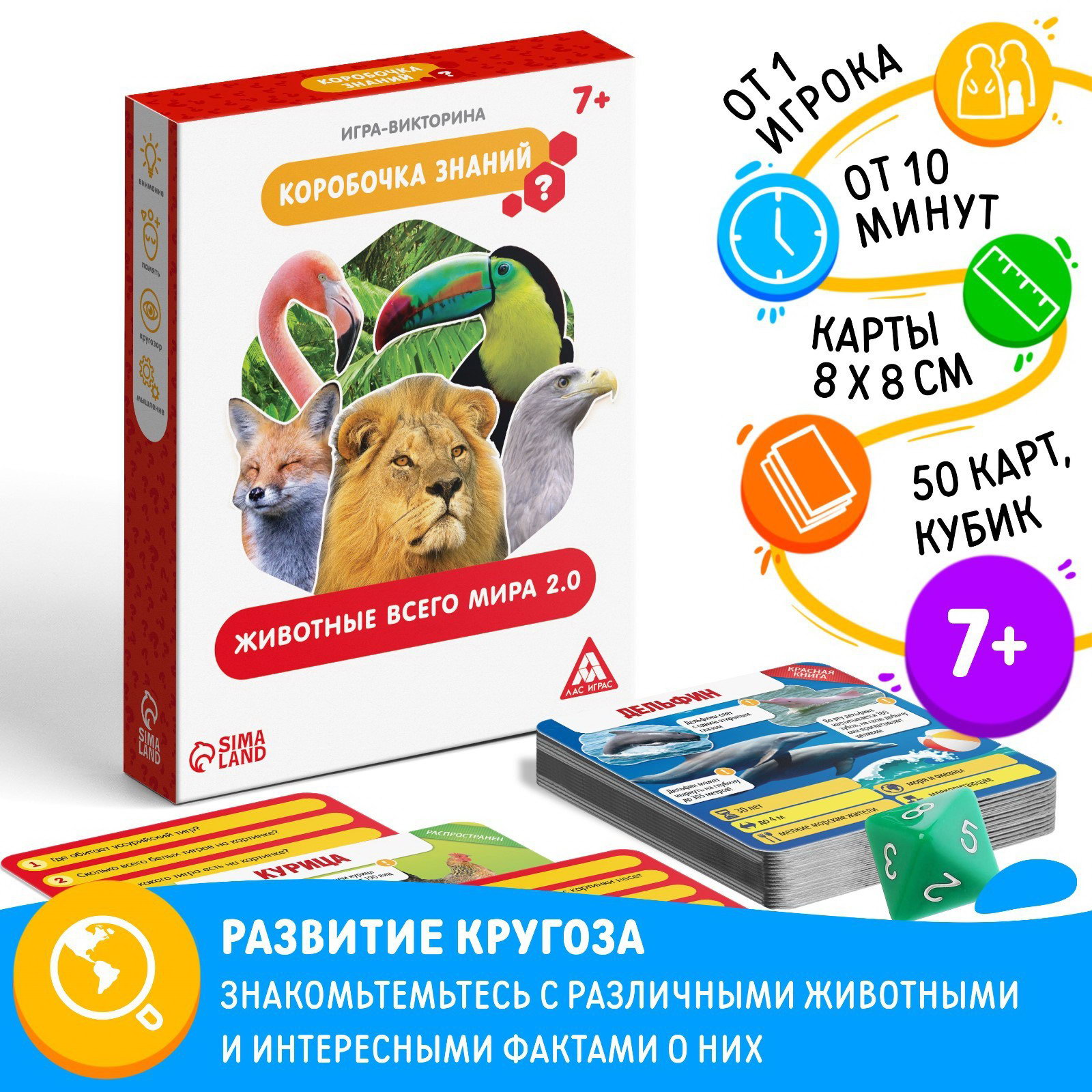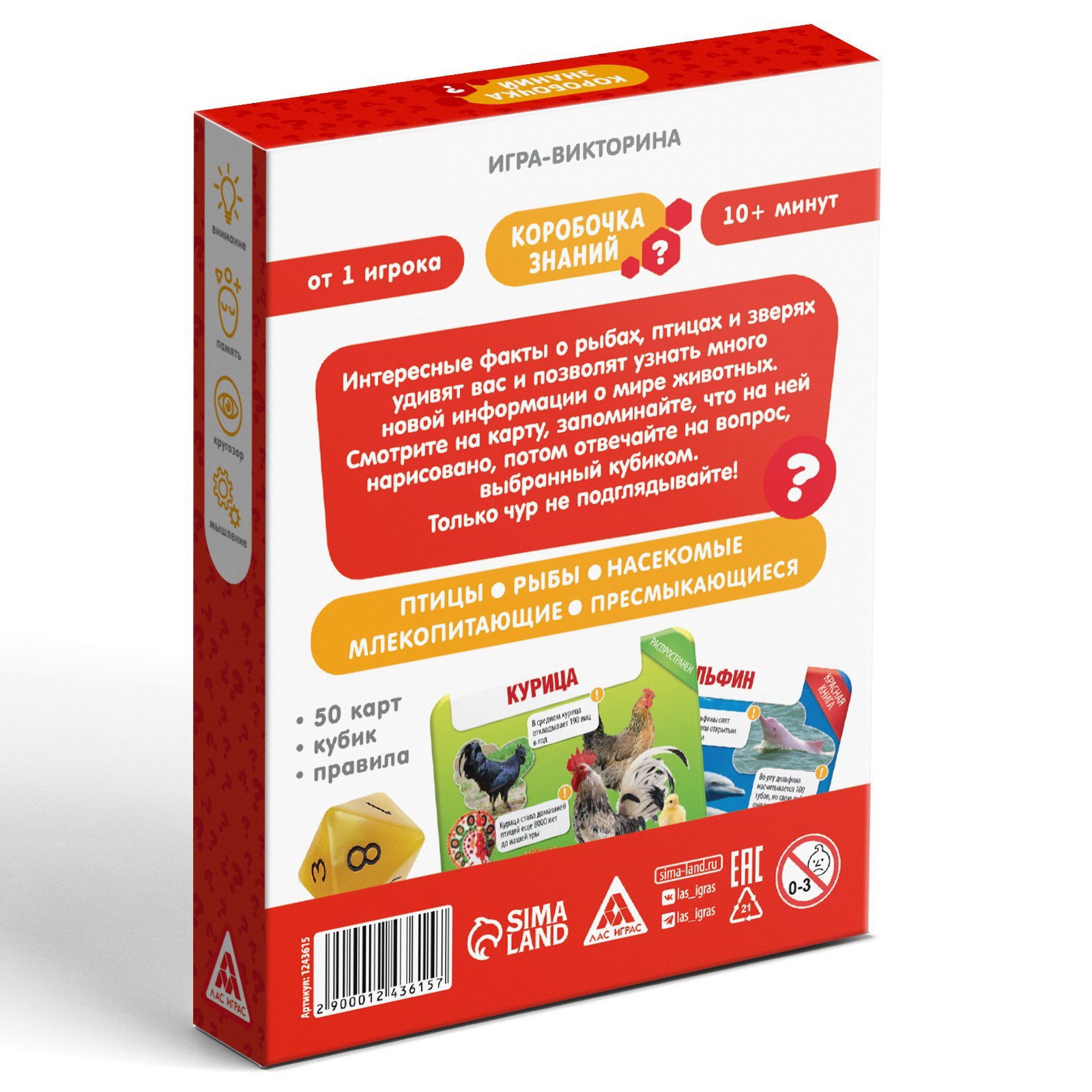 Настольная игра-викторина "Коробочка знаний. Животные всего мира", 50 карт, кубик, 7+, 9.5x12.5x2 см., ЛАС ИГРАС, Китай