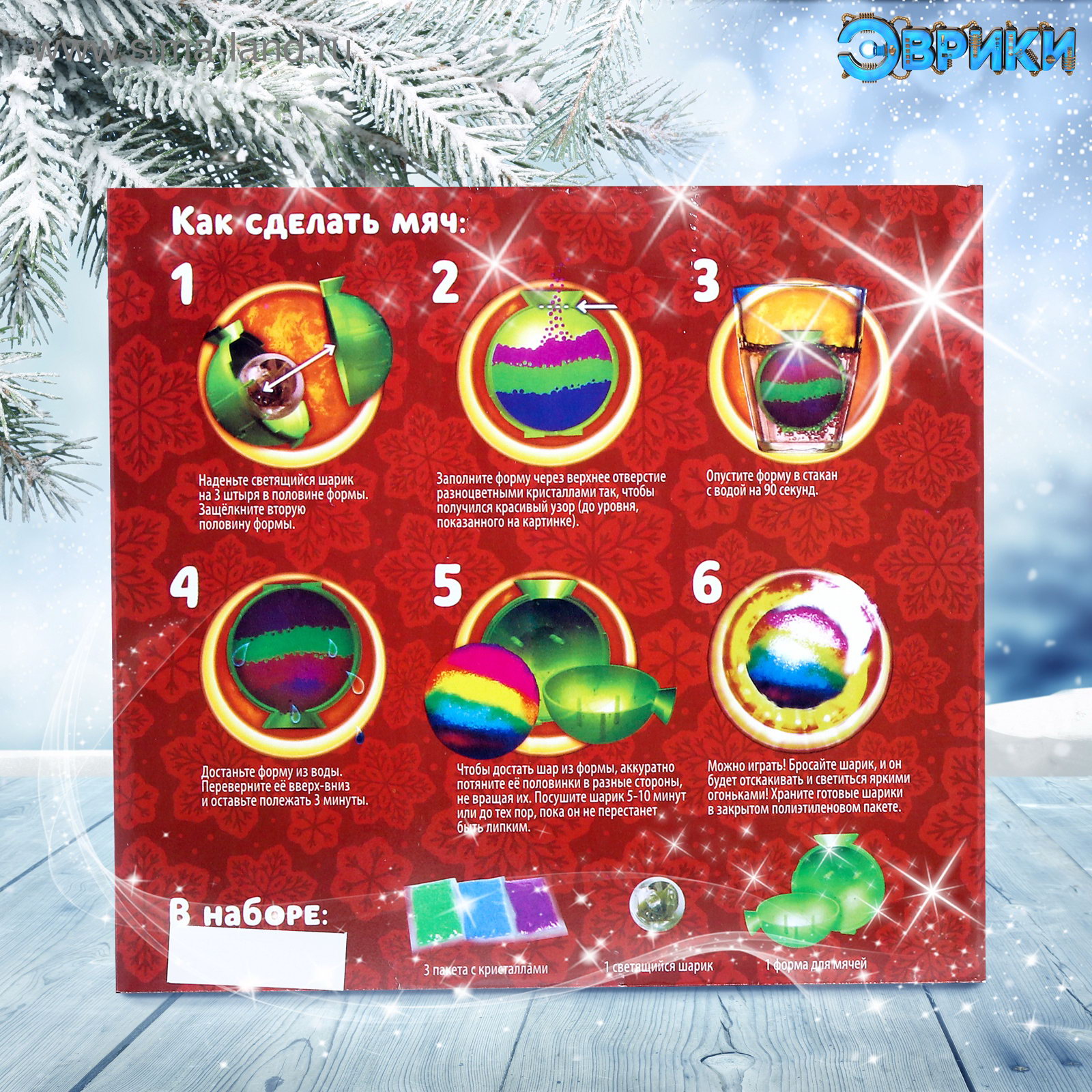 Размер упаковки: 4 x 14 x 15 см. Для кого: Унисекс Для кого: Унисекс tnved: 9503007000 Возраст: От 3 лет Типоразмер батареек: LR1130 Количество батареек: 4 Свет: Да Работает от батареек: Да Батарейки в комплекте: Да Тематика праздника: Новый год Вид исследований: Опыты с реагентами Количество опытов: 1 Вид науки: Химия Набор для создания ярких и упругих мячей это увлекательный эксперимент, который понравится детям. С помощью специального порошка, формы и диода ребёнок сможет самостоятельно сделать миниатюрные игрушки, которые не только подпрыгивают, но и могут светиться. Процесс напоминает волшебство и станет отличным досугом для всей семьи. Что внутри?