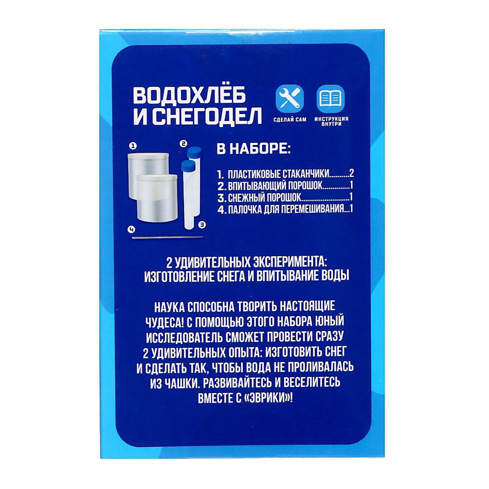 Рекомендации по использованию Набор предназначен для детей старше 3 лет. Рекомендуется проводить опыты под присмотром взрослых, строго следуя инструкции. После завершения экспериментов все материалы следует утилизировать согласно рекомендациям производителя. Подарите ребёнку возможность почувствовать себя настоящим учёным и открыть для себя удивительный мир химических реакций с набором "Водохлёб и снег". | ||