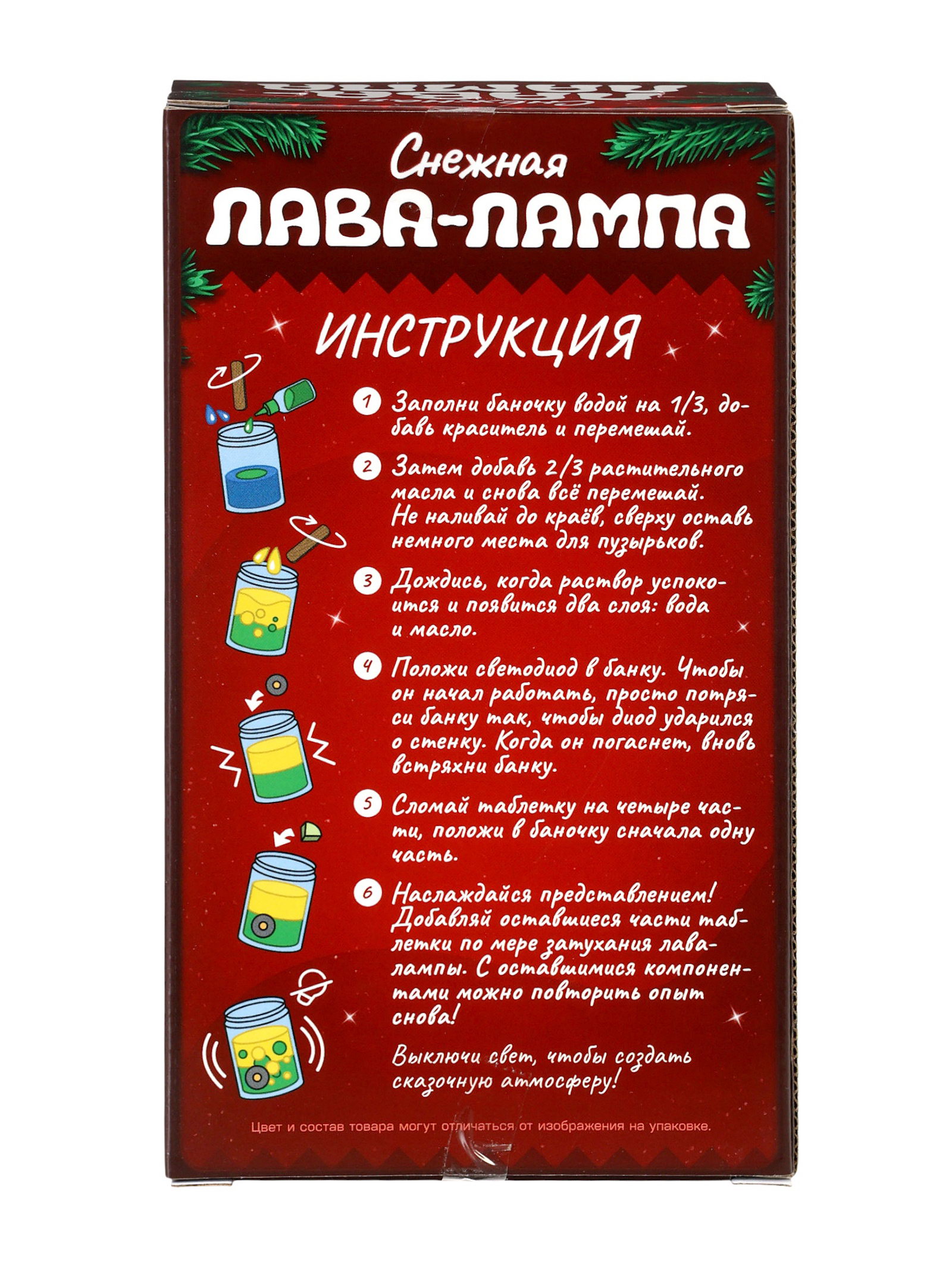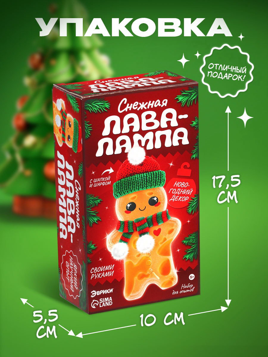 Размер упаковки: 5.5 x 17.5 x 10 см. tnved: 9503007000 Количество опытов: 1 Вид исследований: Опыты с реагентами Вид науки: Химия Возраст: От 5 лет Для кого: Унисекс Тематика праздника: Новый год Хочешь маленькое чудо дома? Сделай свою светящуюся "лаву" прямо на столе. Опыт "Лава-лампа с Пряней" – короткий и наглядный сет для первой домашней лаборатории и семейных экспериментов.