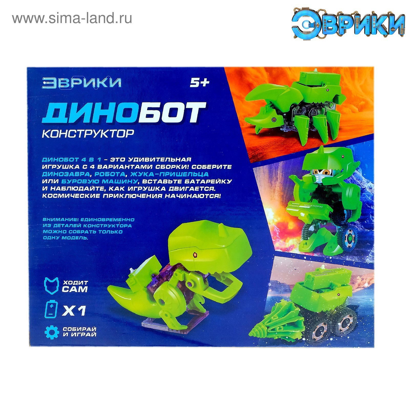 Робот 4 в 1 "Динобот", электронный конструктор, на батарейках, 5.5x23x19 см., Эврики, Китай