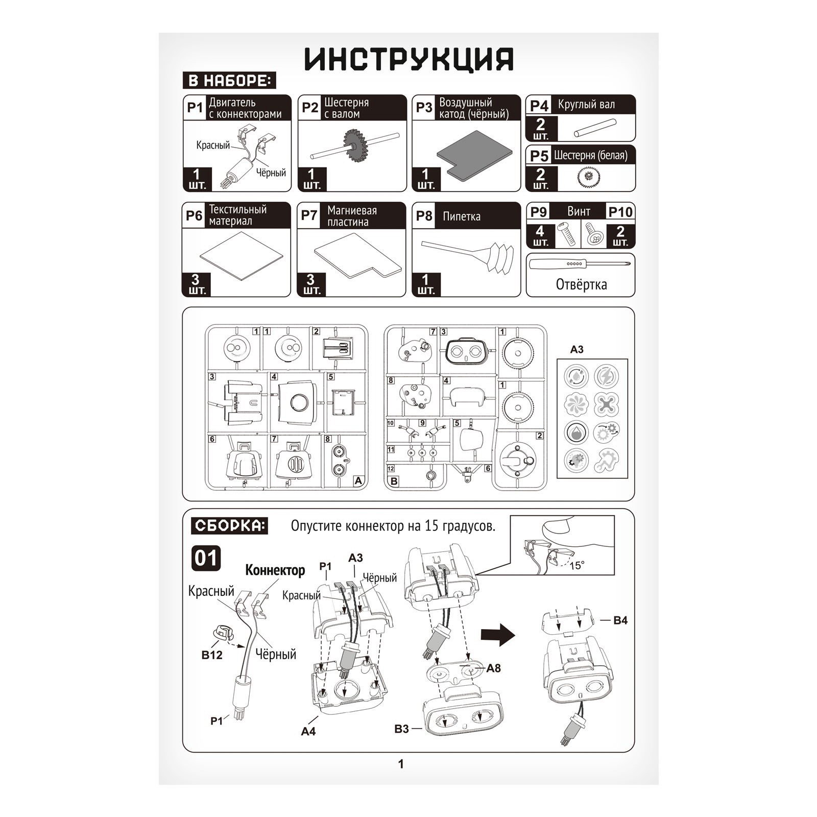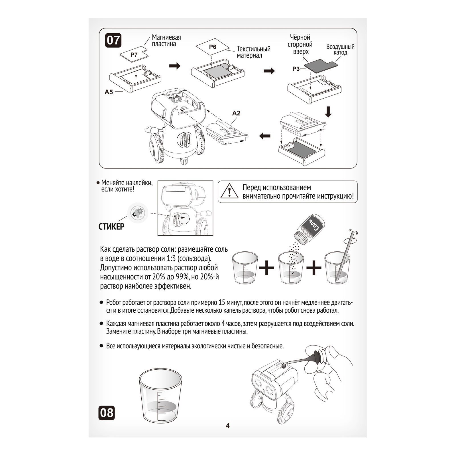 Обратите внимание! Робот работает от раствора соли примерно 15 минут. После этого он начнёт медленнее двигаться и в итоге остановится. Добавьте несколько капель раствора чтобы робот снова работал. Каждая магниевая пластина работает около 4 часов, затем разрушается под воздействием соли. Все использующиеся материалы экологически чистые и безопасные. Учимся играя Сборка модели поможет в развитии мелкой моторики, логики, мышления и воображения. В процессе увлекательной игры маленький исследователь познакомится с принципом работы электричества. Серия конструкторов "Эврики. Робототехника" В серию вошли наборы по созданию различных подвижных моделей роботов в виде техники, животных, транспорта, космических кораблей и т.д. Собранные модели работают не только от привычных элементов питания, но и от альтернативных источников: солнечных батарей и самодельных батарей (вода с солью) и пр. С такими наборами знакомиться с техникой будет просто и увлекательно! | ||