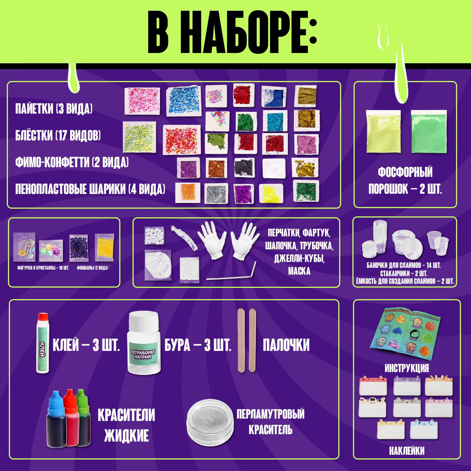 Набор для опытов "Меганабор для создания слаймов", своими руками, 10 фигурок и кристаллов, 18x18.5x15.5 см., Школа талантов, Китай