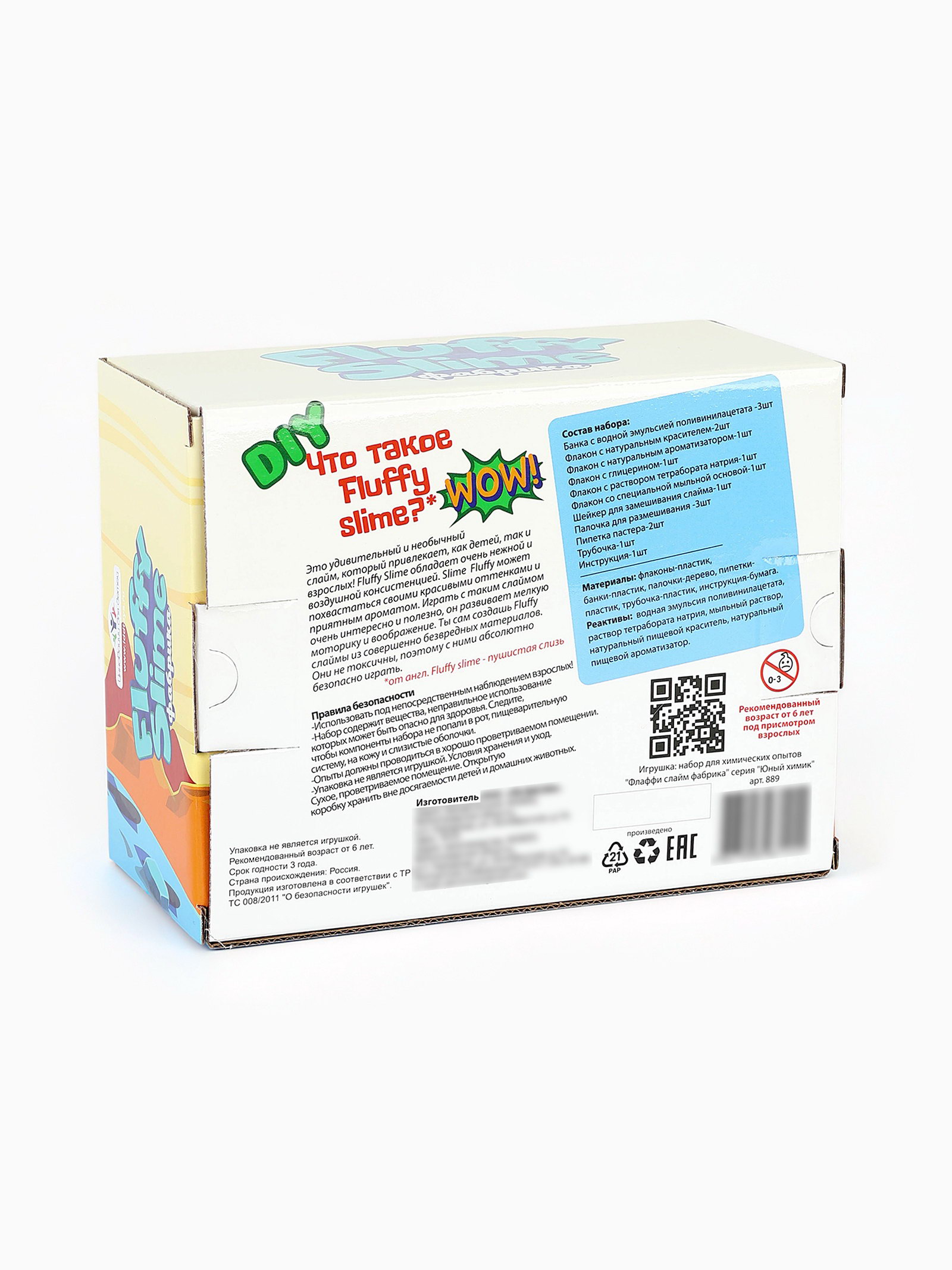 Размер упаковки: 14.5 x 9 x 18.5 см. tnved: 9503007000 Температурное ограничение: Нет Возраст: От 3 лет Тип: Создание слайма Вид науки: Химия Для кого: Унисекс Идеальное решение для детей, которые любят экспериментировать и создавать что-то своими руками!Набор позволяет сделать 3 слайма каждый будет уникальным. Все ингредиенты легко смешиваются, а простая инструкция делает процесс понятным даже для новичков. Это отличный способ развить фантазию, моторику и провести время весело и с пользой. В наборе: