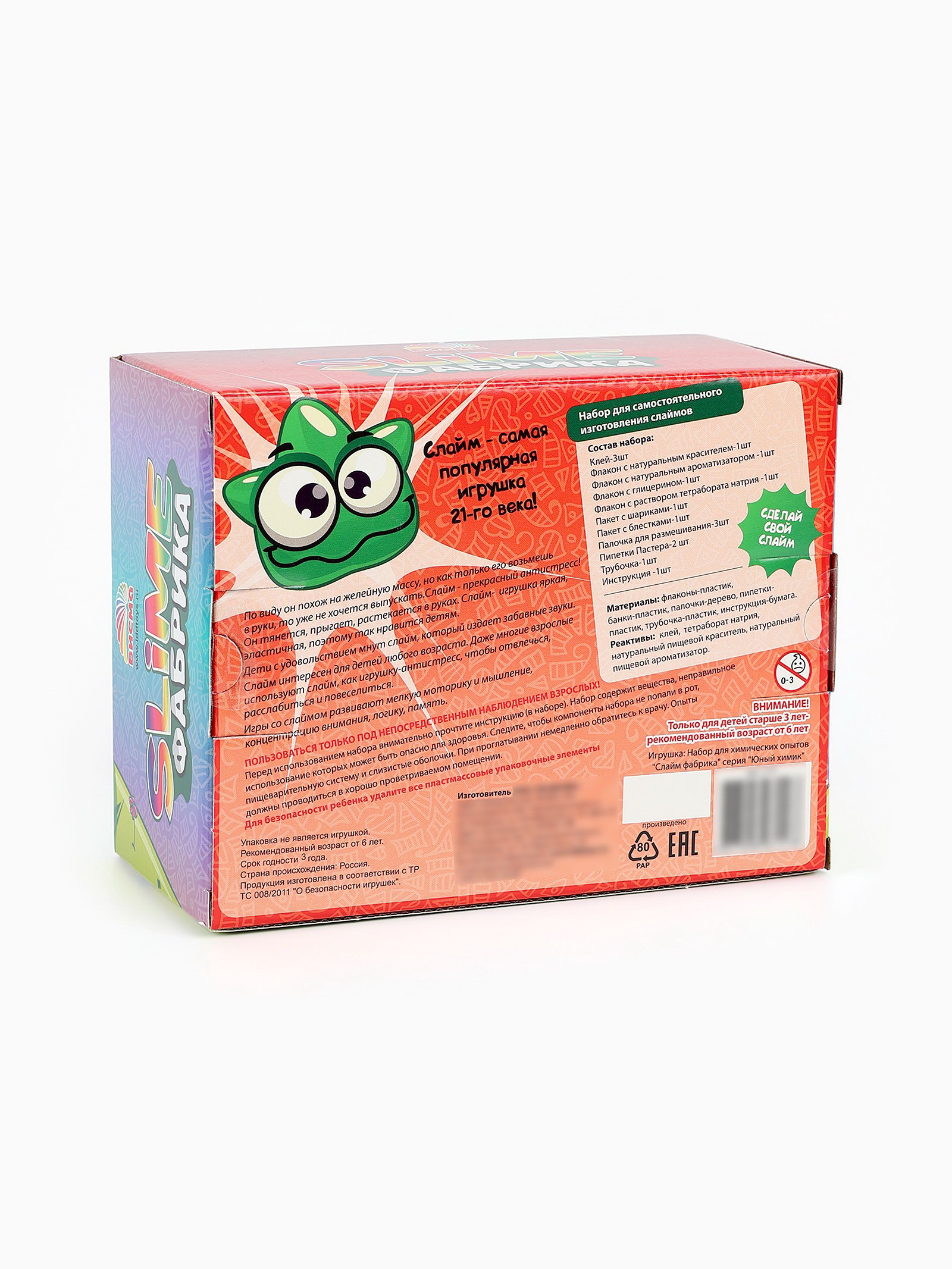 Размер упаковки: 14.5 x 9 x 18.5 см. tnved: 9503007000 Температурное ограничение: Нет Возраст: От 3 лет Тип: Создание слайма Вид науки: Химия Для кого: Унисекс Идеальное решение для детей, которые любят экспериментировать и создавать что-то своими руками!Набор позволяет сделать 3 разнообразных слайма каждый будет уникальным. Все ингредиенты легко смешиваются, а простая инструкция делает процесс понятным даже для новичков. Это отличный способ развить фантазию, моторику и провести время весело и с пользой. В наборе: