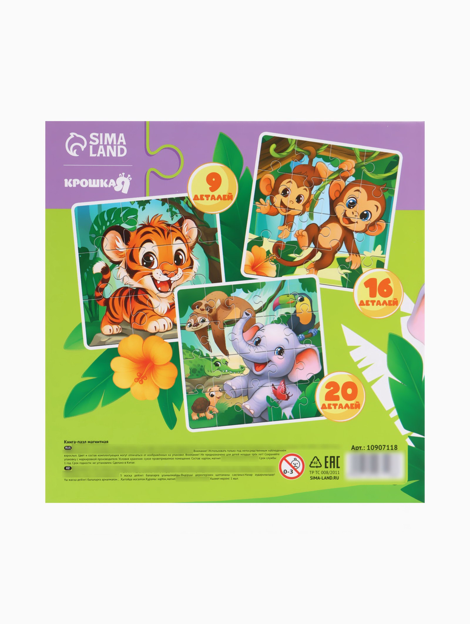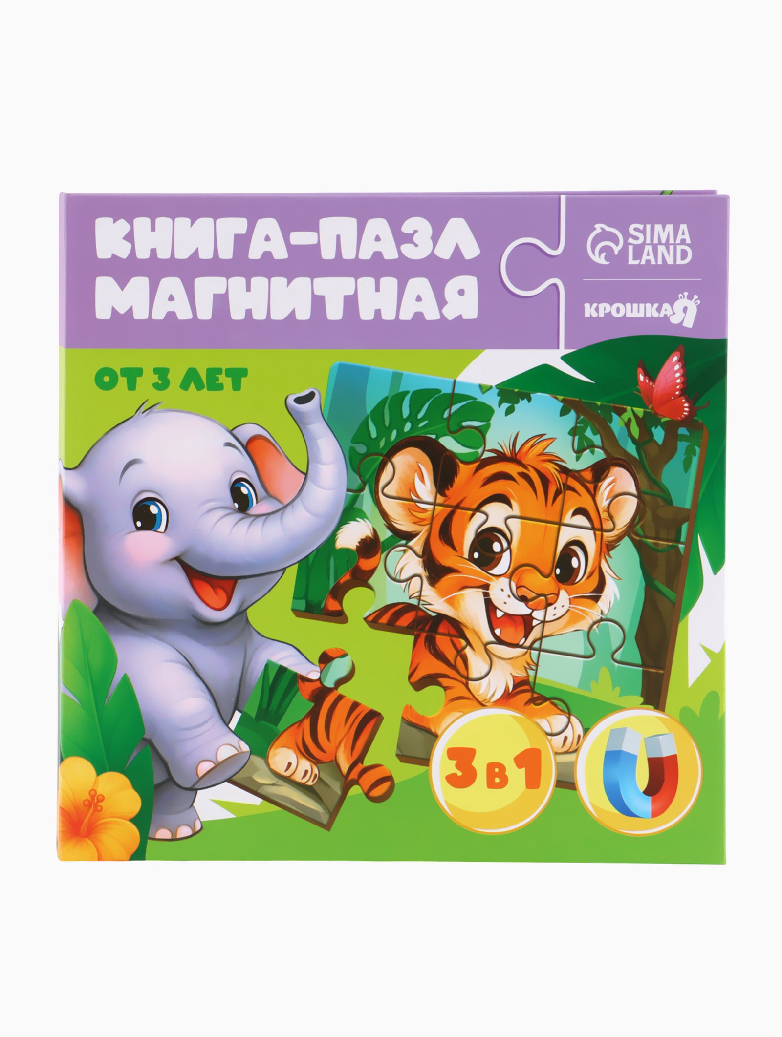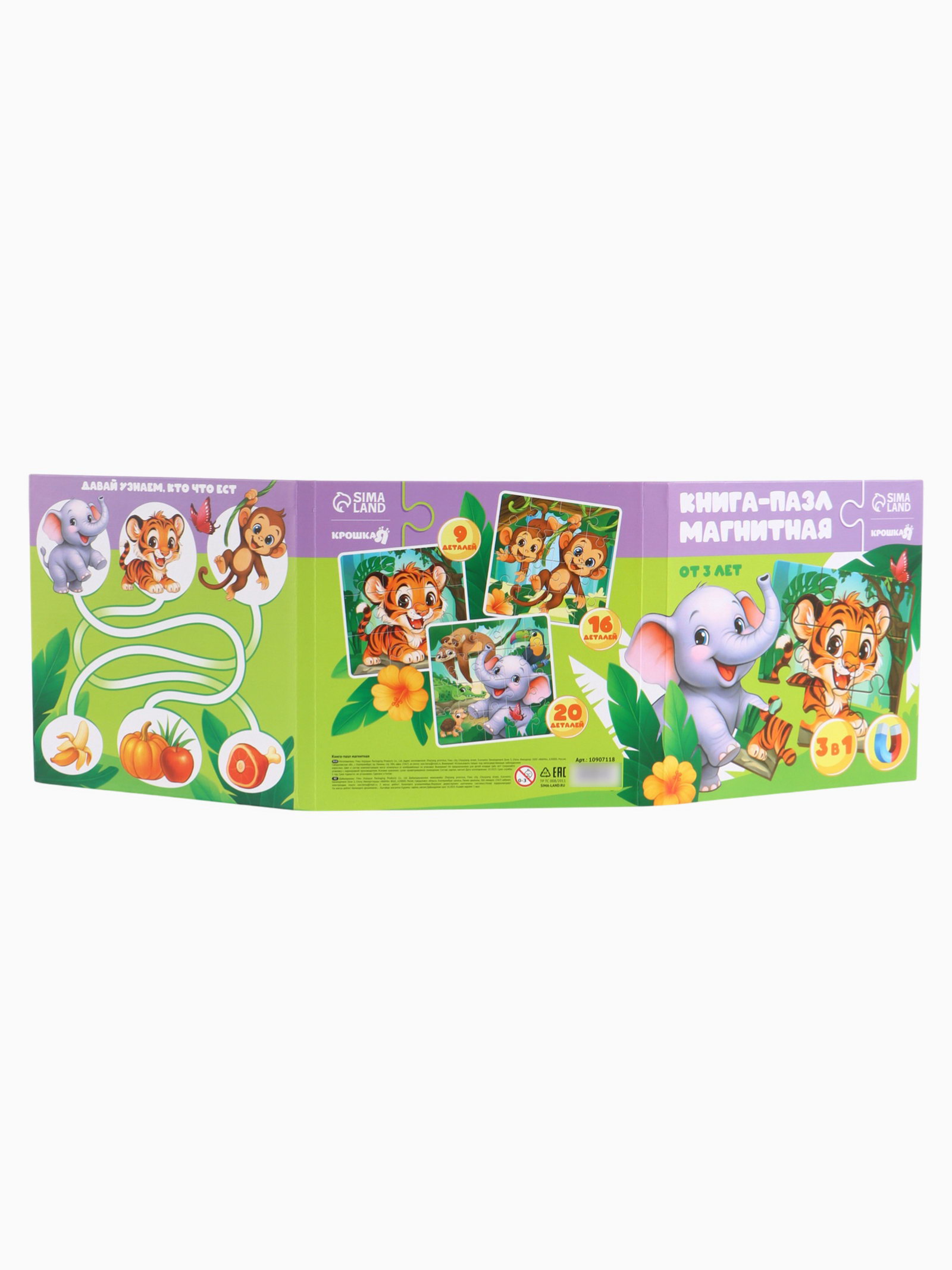 Магнитные пазлы для малышей "Зверята", книга 3 в 1, 18x18x1.5 см., Крошка Я, Китай