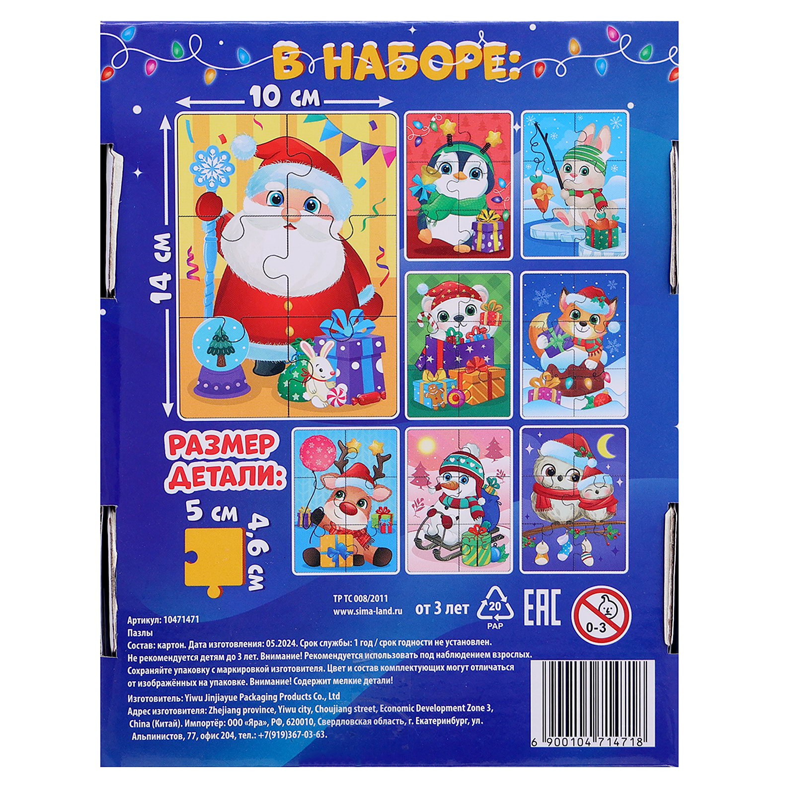 Тематика: Детская, Новогодняя Развитие навыков: Внимание, Моторика, Мышление Размер упаковки: 3.5 x 15.5 x 12.5 см. Форма: Прямоугольник Особенности: Без особенностей Тип пазлов: Классические Для кого: Унисекс Возраст: От 3 лет Вид: Настольные Длина собранного пазла, см: 14 Ширина собранного пазла, см: 10 Количество элементов: 48 Тематика праздника: Новый год Тематика праздника: Новый год tnved: 9503007000 Макси-пазлы 8 в 1 "Ждут зверята Новый год" то, что нужно для полезного и интересного досуга! Такой подарок поможет скрасить ожидание Нового года, а также потренировать мелкую моторику, внимательность, логическое мышление и память. Ребёнок соберёт 8 пазов из 48 крупных деталей с новогодним сюжетом. Особенности пазла