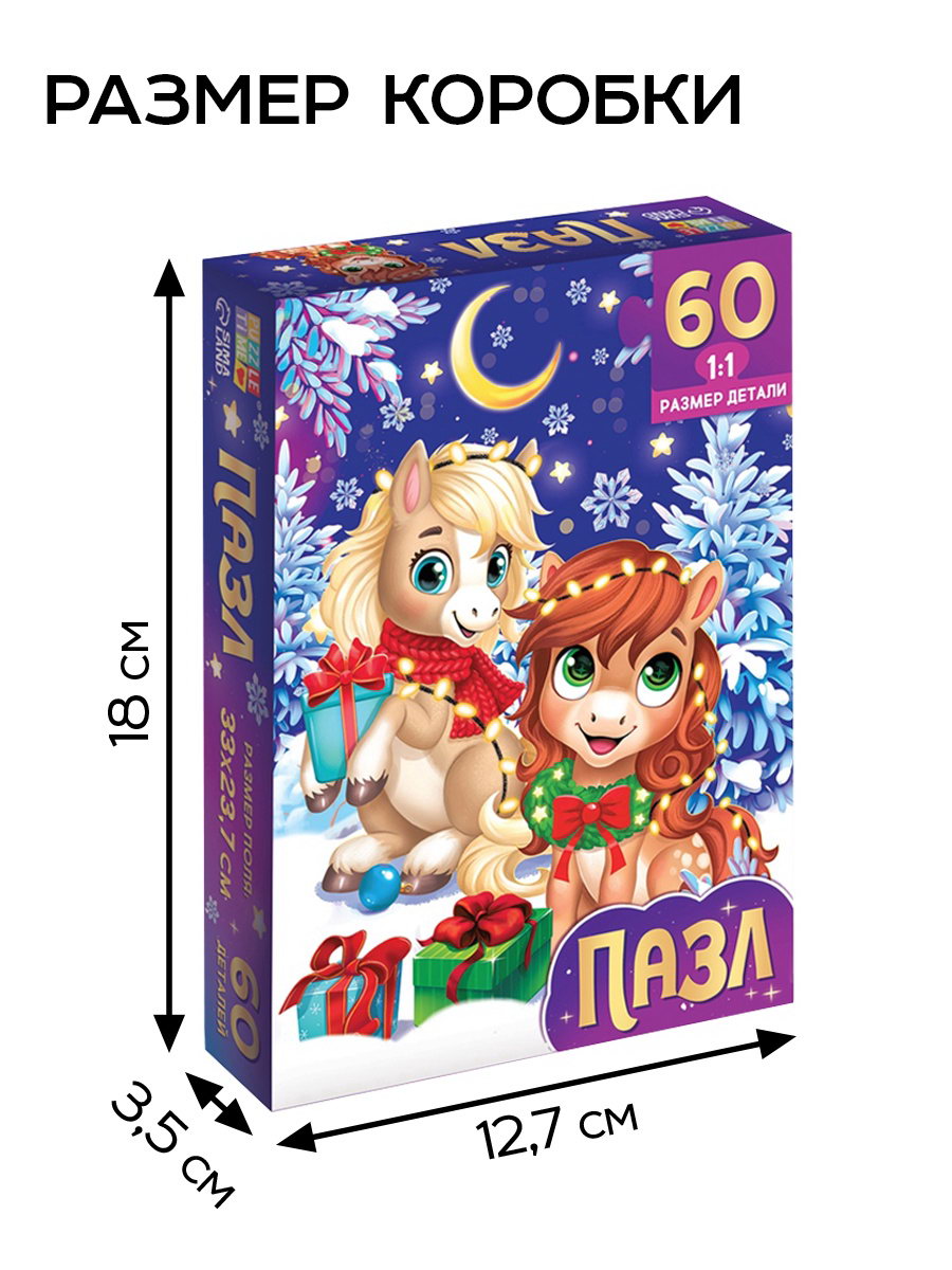 Тематика: Животный мир, Новогодняя Размер упаковки: 12.7 x 3.5 x 18 см. tnved: 9503007000 Форма: Прямоугольник Особенности: Без особенностей Количество элементов: 60 Длина собранного пазла, см: 23.7 Ширина собранного пазла, см: 33 Вид: Настольные Возраст: От 3 лет Тип пазлов: Классические Для кого: Унисекс Животное восточного календаря: Лошадь Тематика праздника: Новый год Новогодний пазл "Лошадки" это яркая головоломка из 60 элементов, которая перенесёт ребёнка в атмосферу зимней сказки и праздника. Этот классический пазл создан для детей от 3 лет и станет прекрасным подарком или развлечением на новогодних каникулах. Собирая пазл, ребёнок создаёт красочную картину с милыми лошадками, которые дарят ощущение радости и волшебства. Особенности