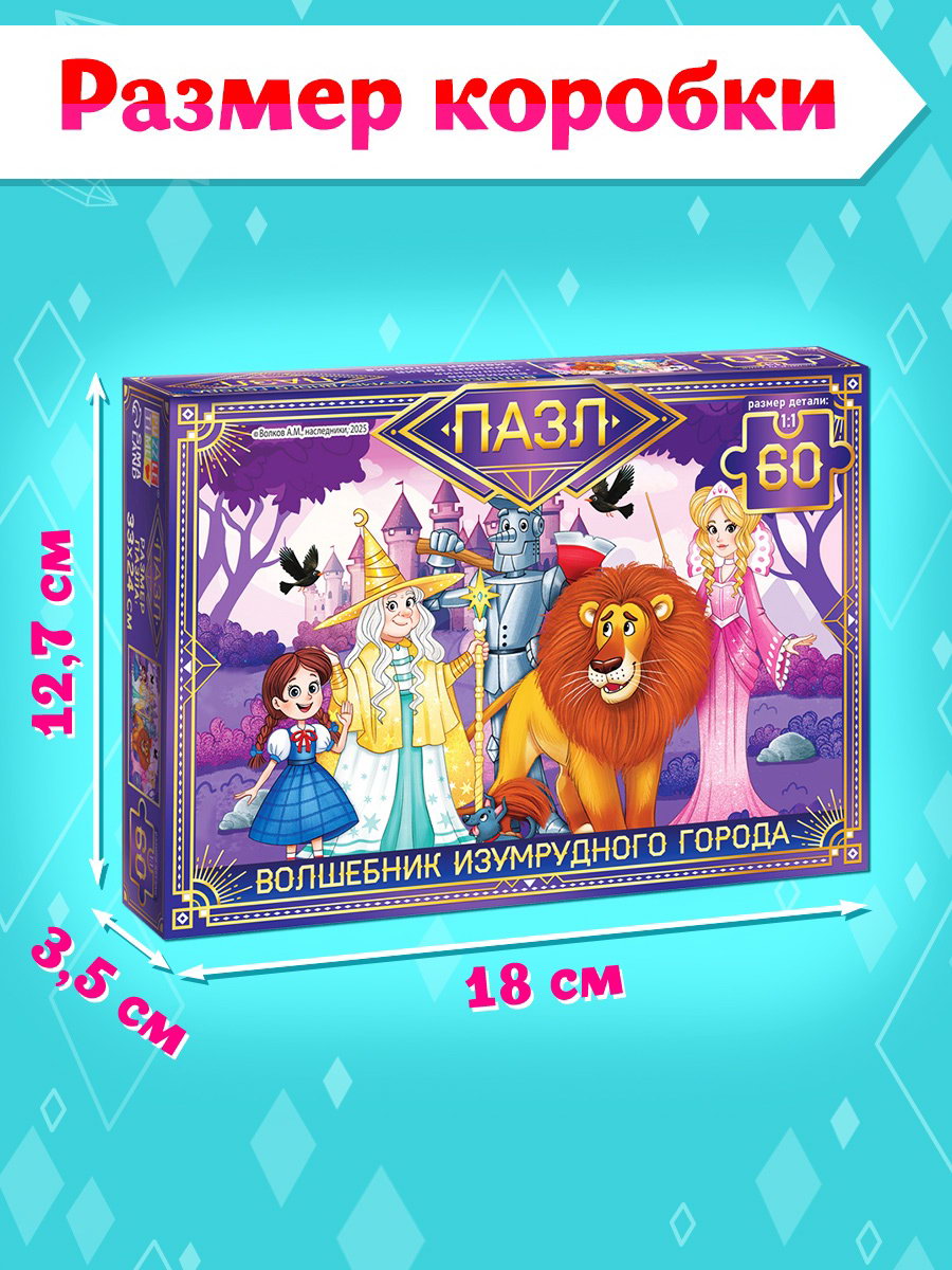 Для кого: Для девочки, Для мальчика, Унисекс Размер упаковки: 3.5 x 13 x 18 см. tnved: 9503007000 Возраст: От 3 лет Длина собранного пазла, см: 33 Особенности: Без особенностей Форма: Прямоугольник Вид: Настольные Тип пазлов: Классические Ширина собранного пазла, см: 23.7 Тематика: Сказки Количество элементов: 60 Этот пазл как возвращение в знакомое приключение. Ребёнок не просто собирает картинку он снова встречается с Элли, Тотошей, Львом, Железным Дровосеком и Страшилой. Каждая деталь шаг к Изумрудному городу, где важно не только добраться, но и понять, что самое ценное это дружба, смелость и сердце. Почему дети выбирают этот пазл: