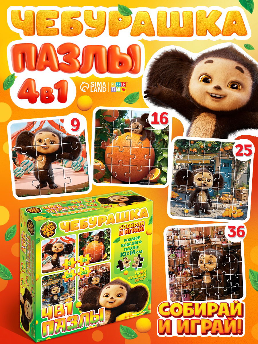 Пазлы 4в1 "Чебурашка", 9, 16, 25, 36 деталей, 18x18x2.5 см., ЧЕБУРАШКА, Китай
