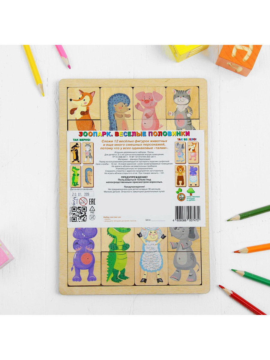 Возраст: Детский, От 3 лет Развитие навыков: Кругозор, Логика Размер упаковки: 17.5 x 1 x 25 см. tnved: 9503006000 Для кого: Унисекс Вид: Настольные Количество элементов: 24 Тематика: Животный мир Тип пазлов: Пазлы в рамках Форма: Прямоугольник Длина собранного пазла, см: 15.2 Ширина собранного пазла, см: 22.8 Особенности: В рамке Вид мозаики: Пазл Тематика праздника: Универсальная тематика Вид головоломки: Пазлы и мозаика Температурное ограничение: Нет Жанр игры: Развивающая Количество игроков: [1,2] Деревянные пазлы "Зоопарк" это увлекательная игра для детей от 3 лет, которая помогает изучать животных, развивать логическое мышление и расширять кругозор. В комплекте 24 детали, из которых можно собрать 12 фигурок животных или создать фантазийные существа. Особенности