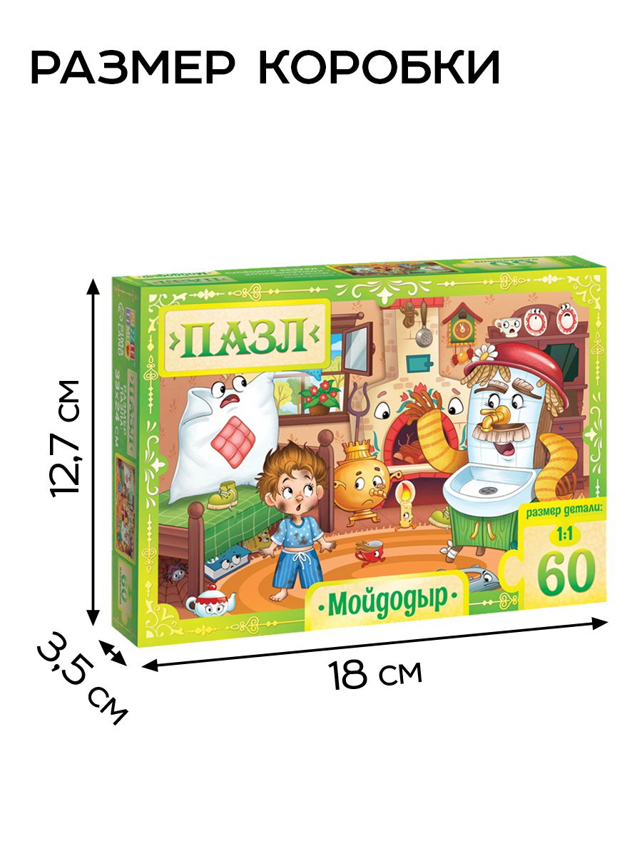 Размер упаковки: 12.7 x 3.5 x 18 см. tnved: 9503007000 Ширина собранного пазла, см: 24 Длина собранного пазла, см: 33 Особенности: Без особенностей Тип пазлов: Классические Форма: Прямоугольник Вид: Настольные Для кого: Унисекс Возраст: От 4 лет Тематика: Сказки Количество элементов: 60 Пазл "Мойдодыр" это яркая головоломка из 60 элементов, которая перенесёт ребёнка в мир любимых сказок Корнея Чуковского. Этот классический пазл создан для детей от 4 лет и станет прекрасным подарком или развлечением для семейного досуга. Собирая пазл, ребёнок создаёт красочную картину с героями известной истории, которые учат важным урокам о чистоте и заботе. Особенности