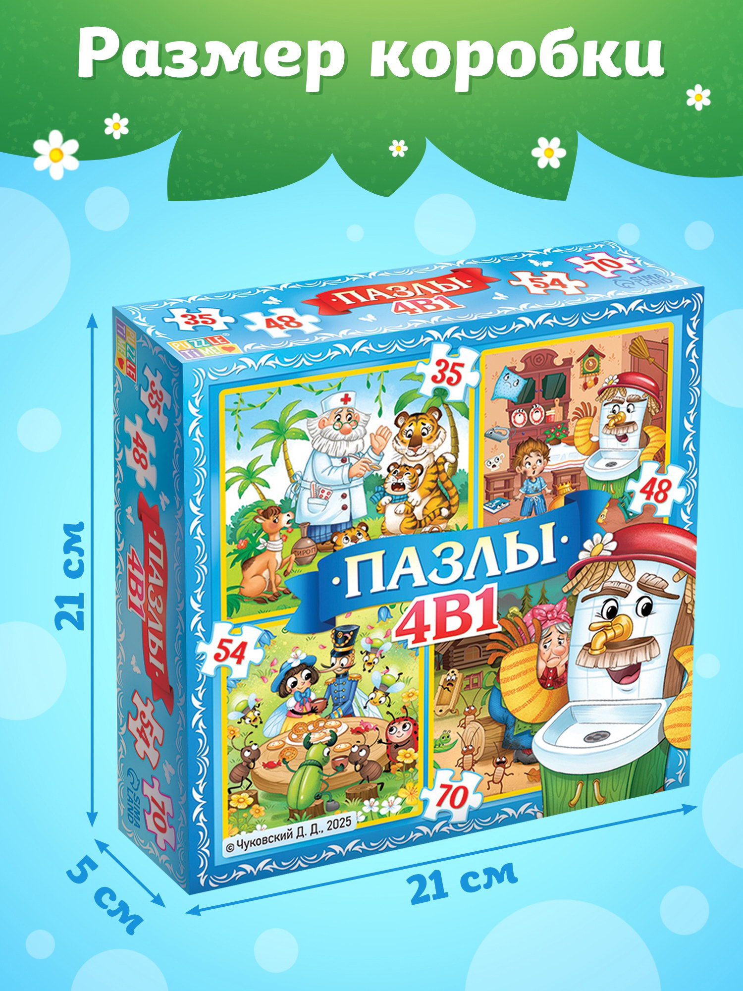 Тематика: Мультфильмы, Сказки Для кого: Для девочки, Для мальчика, Унисекс Количество элементов: 35, 48, 54, 70 Размер упаковки: 18 x 5 x 18 см. tnved: 9503007000 Вид: Настольные Возраст: От 3 лет Форма: Квадрат Особенности: Набор Тип пазлов: Классические "Сказки Корнея Чуковского" это 4 пазла в одной коробке, где каждая картинка отдельная история. Мойдодыр велит мыться, Доктор Айболит уже в пути. Собирая пазлы, ребёнок не просто складывает картинку он вспоминает сюжеты, которые знают все в семье. Почему это цепляет с первых деталей:
