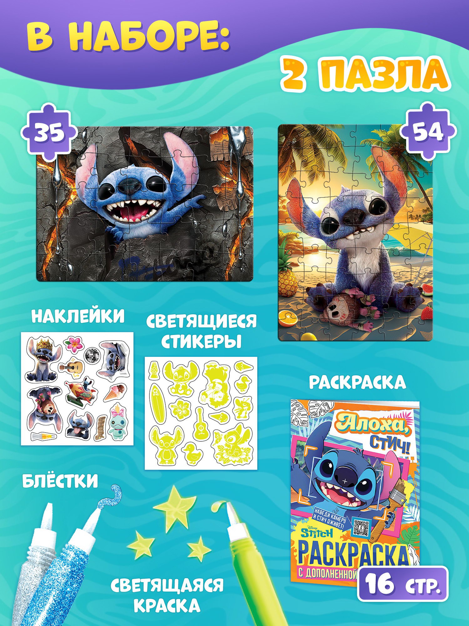 В наборе: 2 разных пазла, раскраска, наклейки, светящиеся стикеры, светящаяся краска и блестки. Создавайте красивые картины и развивайте свои навыки с этим набором для творчества отличный подарок для маленьких любителей творчества и головоломок! | ||