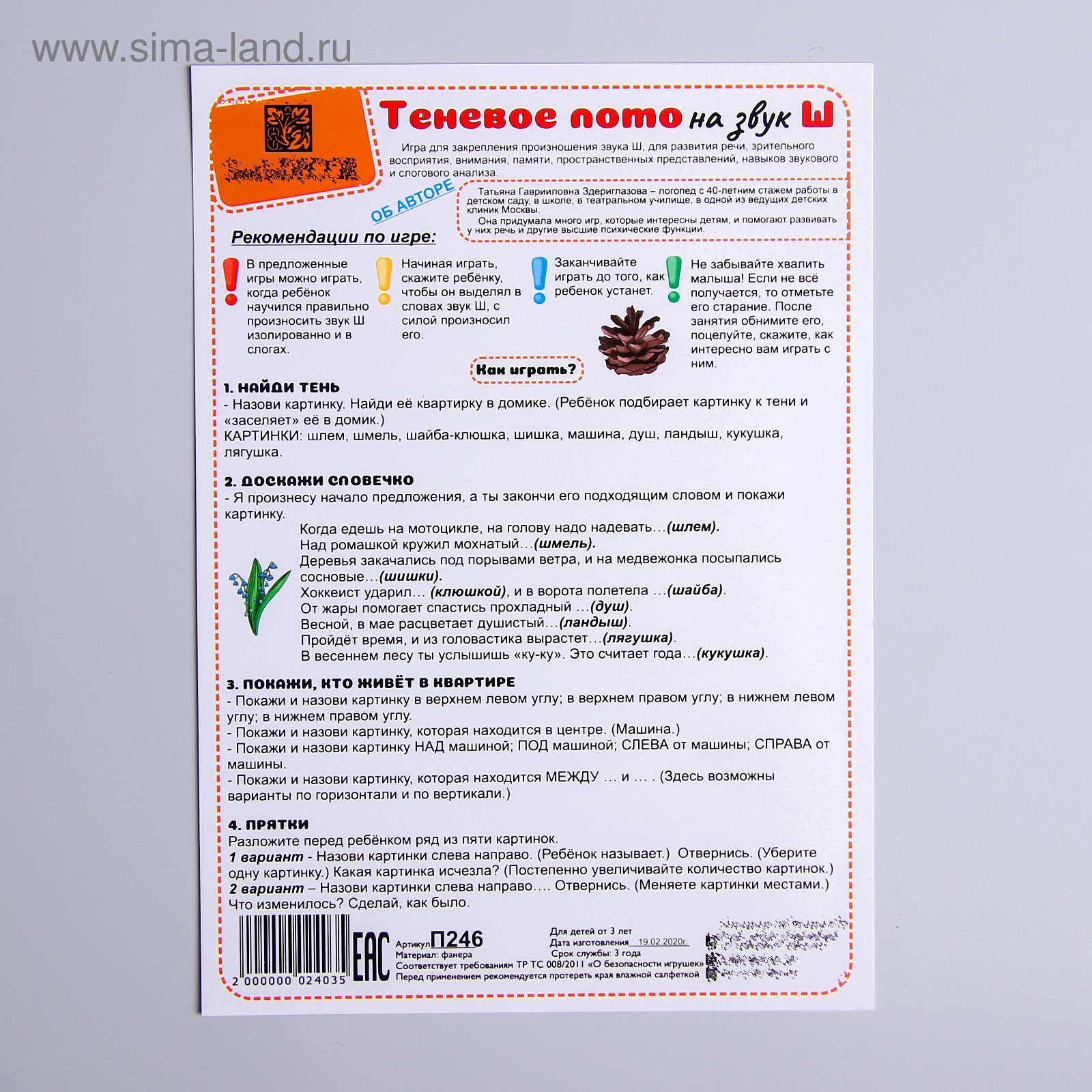 Размер упаковки: 22.5 x 0.7 x 27 см. Для кого: Унисекс Для кого: Унисекс tnved: 9503006000 Температурное ограничение: Нет Вид головоломки: Пазлы и мозаика Возраст: От 3 лет Жанр игры: Домино, лото Тема обучения: Буквы, слова, русский язык Теневое лото это игра для закрепления произношения звуков, развития речи, зрительного восприятия, внимания, памяти, пространственных представлений, навыков звукового и слогового анализа. Как играть?