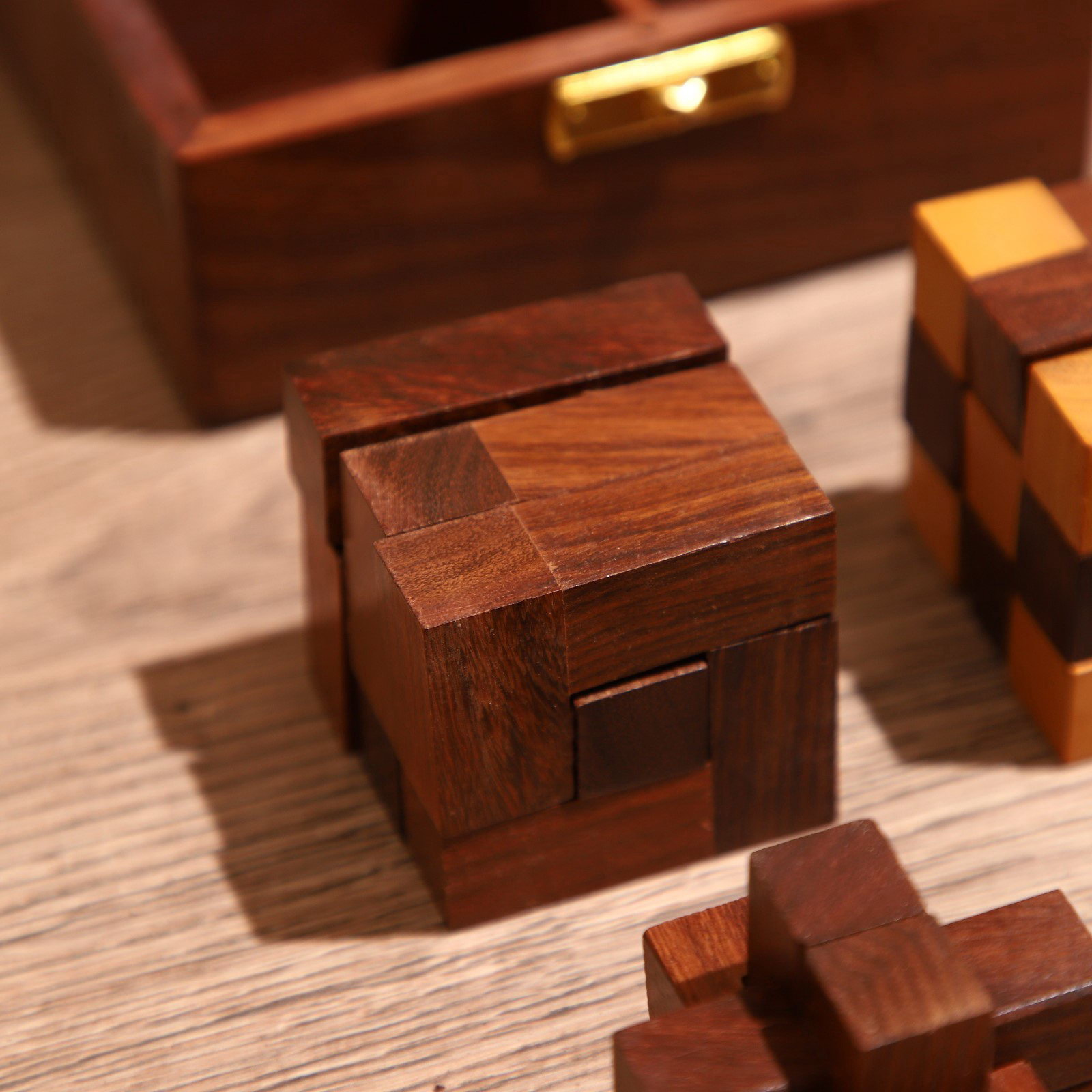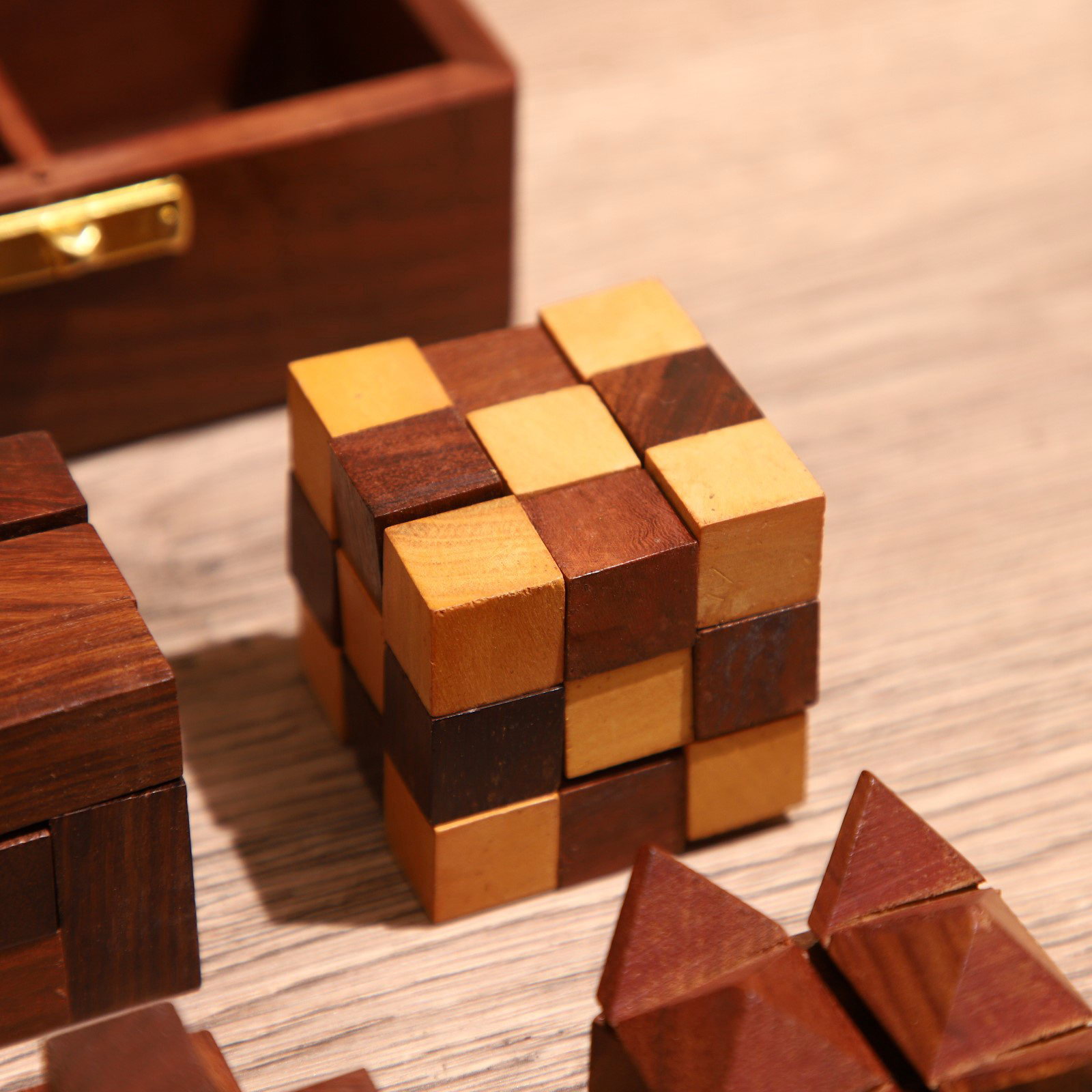 Головоломки в шкатулке, набор 4 шт., 12x13x6 см, дерево шишам, 13x12.5x6.2 см., Индия