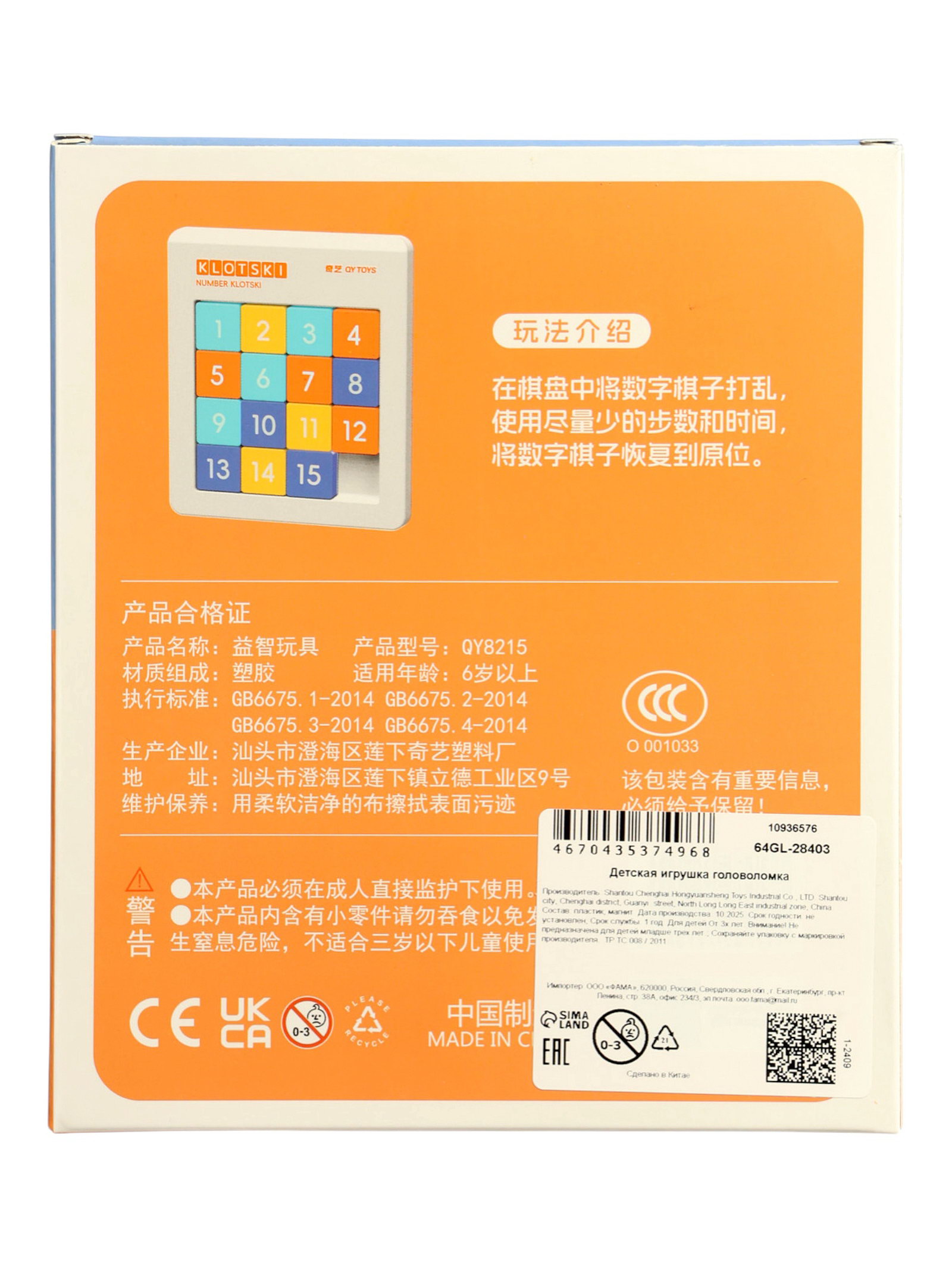 Головоломка "Пятнашки на магнитах", 1.5x15.1x17.6 см., Китай