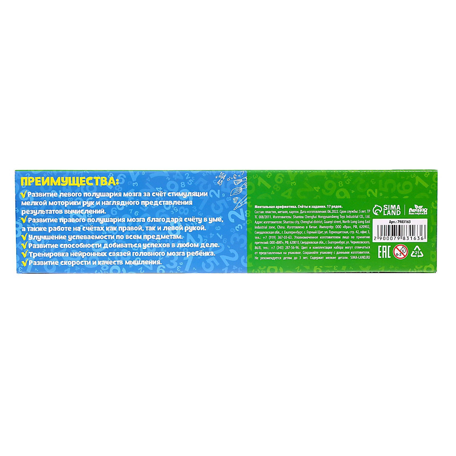 Вид: Настольно-печатные, Счётный материал, Счёты Размер упаковки: 6.7 x 2.3 x 28 см. В наборе, шт.: 1 Для кого: Унисекс tnved: 9503007000 Тема обучения: Цифры, счёт, математика Возраст: От 3 лет Развитие навыков: Счёт Интересная развивающая игра позволит ребёнку с удовольствием окунуться в мир счёта и математики. Ментальная арифметика это один из методов развития интеллекта. В её основе лежит использование абакуса, или соробана, специальных счётов, которые помогают быстрее проводить математические вычисления в уме. Особенности