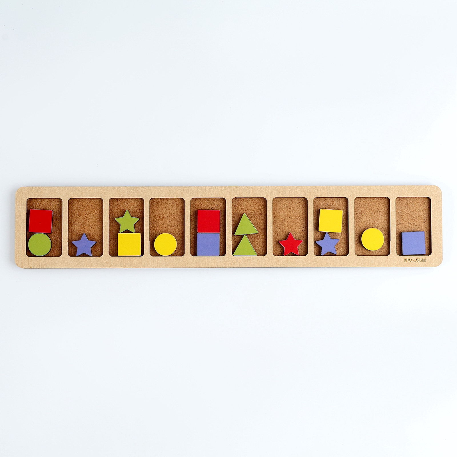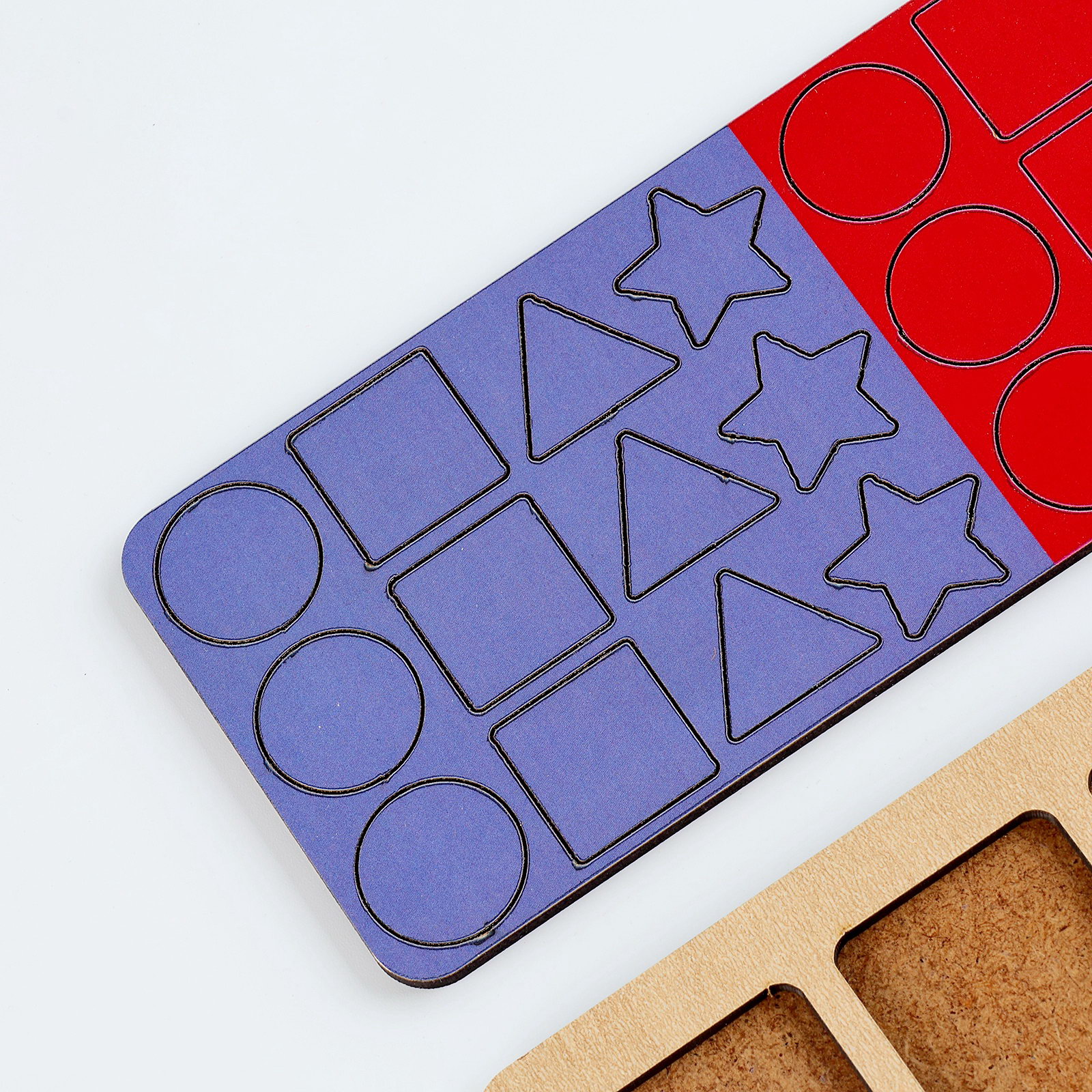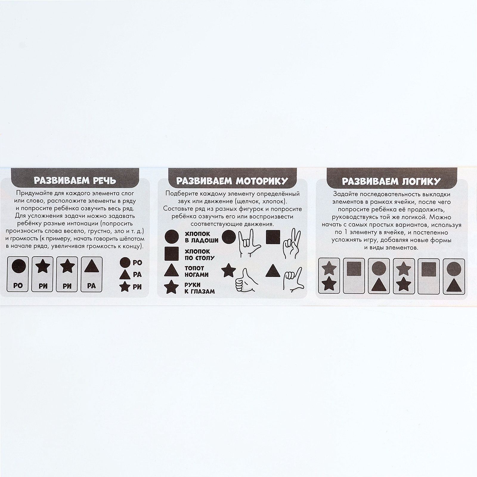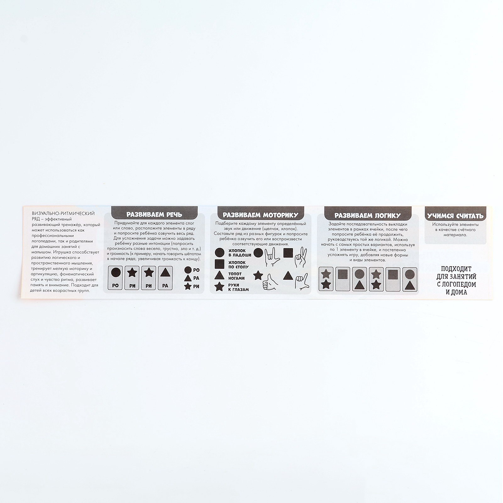 Польза занятий с игрушкой: Игрушка способствует развитию логического и пространственного мышления, тренирует мелкую моторику, артикуляцию, фонематический слух и чувство ритма, развивает память и внимание. Подходит для детей всех возрастных групп. Как играть? Развиваем речь Придумайте для каждого элемента слог или слово, расположите элементы в ряду и попросите ребёнка озвучить весь ряд. Для усложнения задачи можно задавать ребёнку разные интонации (произносить слова весело, грустно, злобно и так далее) и громкость (примеру, начать говорить шепотом в начале ряда, увеличивая громкость к концу). Развиваем моторику Подберите к каждому элементу определённый звук или движение (щелчок, хлопок). Составьте ряд из разных фигурок и попросите ребёнка озвучить его или воспроизвести соответствующие движения. Развиваем логику Задайте последовательность выкладки элементов в рамках ячейки, после чего попросите ребёнка её продолжить, руководству той же логикой. Можно начать с самых простых вариантов, используя по одному элементу в ячейке, и постепенно усложняйте игру, добавляя новые формы и виды элементов. | ||