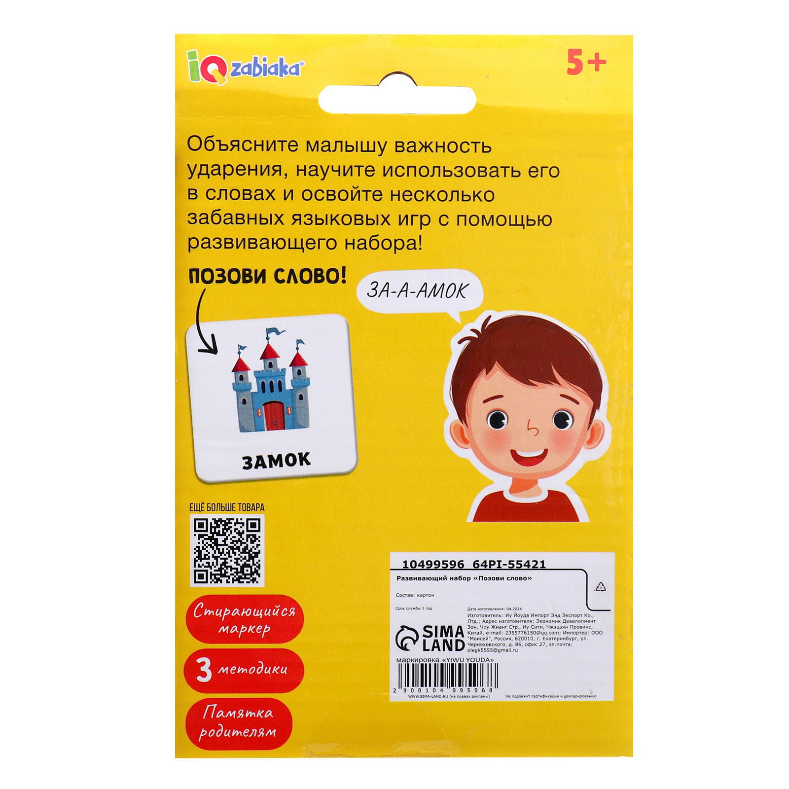 Развитие навыков: Логика, Память, Постановка речи Размер упаковки: 2 x 15 x 10 см. Возраст: От 5 лет Тема обучения: Буквы, слова, русский язык Вид: Настольно-печатные Для кого: Унисекс Для кого: Унисекс tnved: 4911990000 Развивающий набор "Где ударение?" помогает детям освоить правильное произношение слов в русском языке. В игровой форме ребёнок научится ставить ударение, запоминать слова и разовьёт речь. Карточки с заданиями подойдут для занятий дома, в детском саду или начальной школе. Особенности