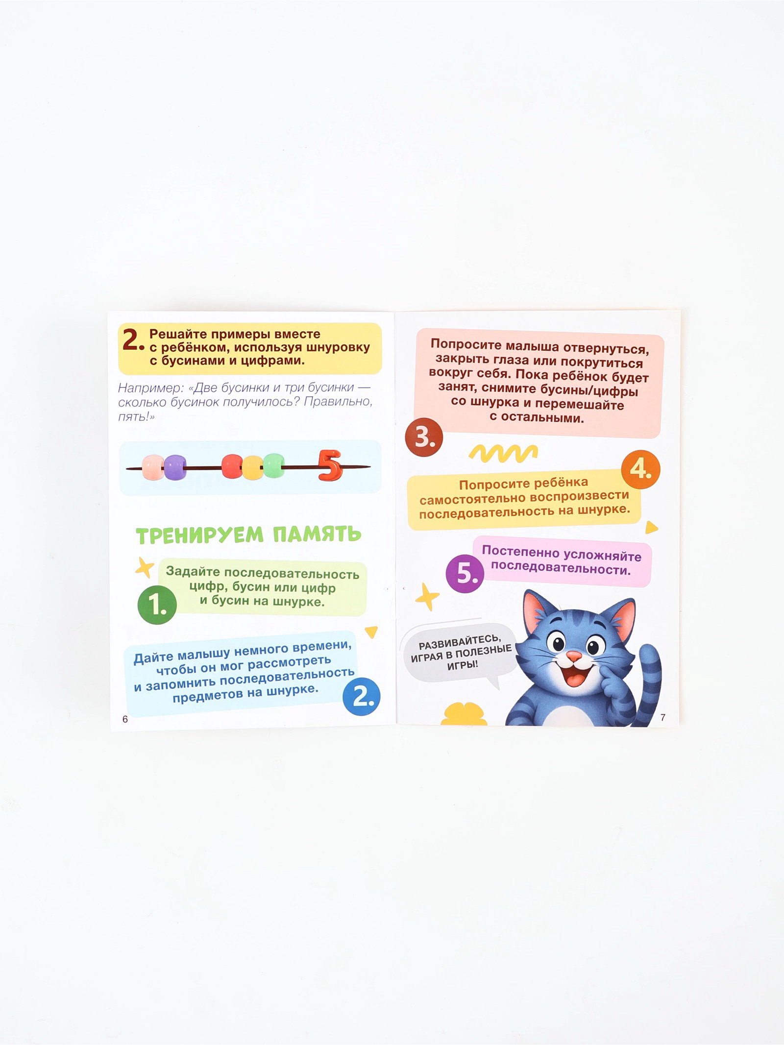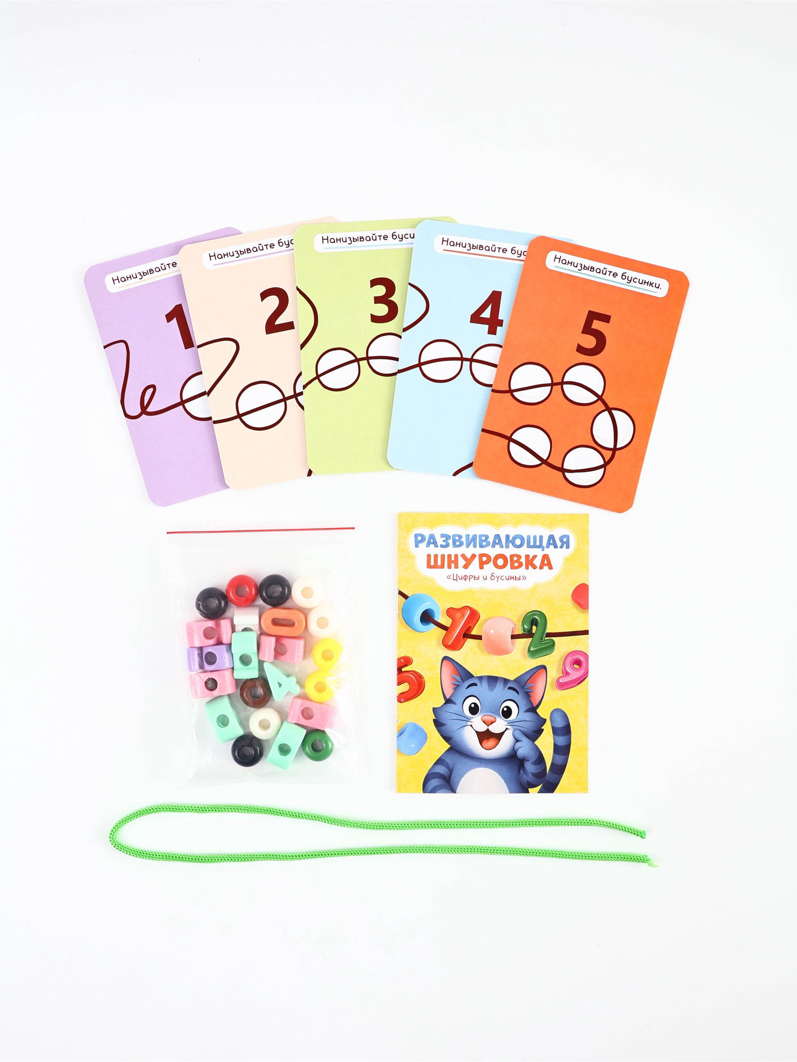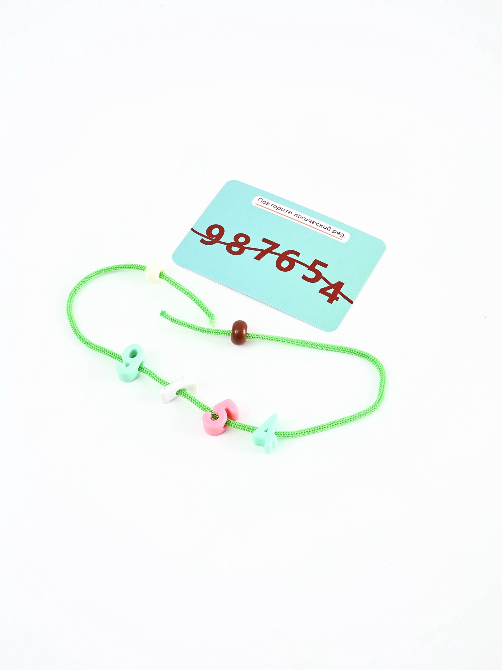 Цель игры: Игрушка помогает ребёнку освоить цифры и счёт, развивать мелкую моторику, концентрацию внимания и координацию рук и глаз через активное участие продевание шнурка через элементы с цифрами и бусинами. Что развивает: