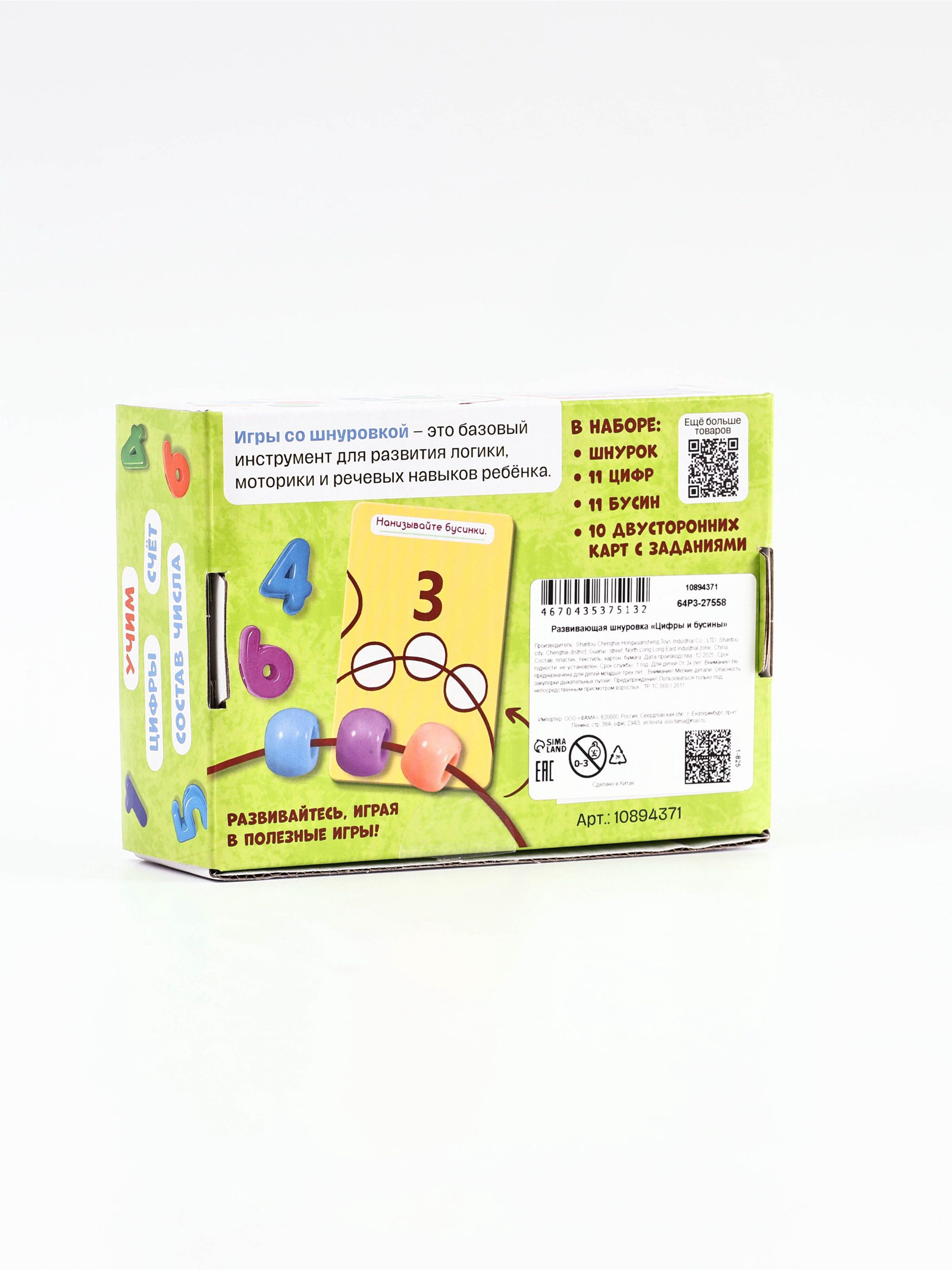 Развитие навыков: Моторика, Счёт Размер упаковки: 11 x 4.5 x 16 см. tnved: 9503007000 Вид: Игра на логику Для кого: Унисекс Возраст: От 3 лет Тема обучения: Цифры, счёт, математика Это увлекательная развивающая игра-шнуровка для детей от 3 лет, которая превращает обучение в интересную и практическую игру. Состав: