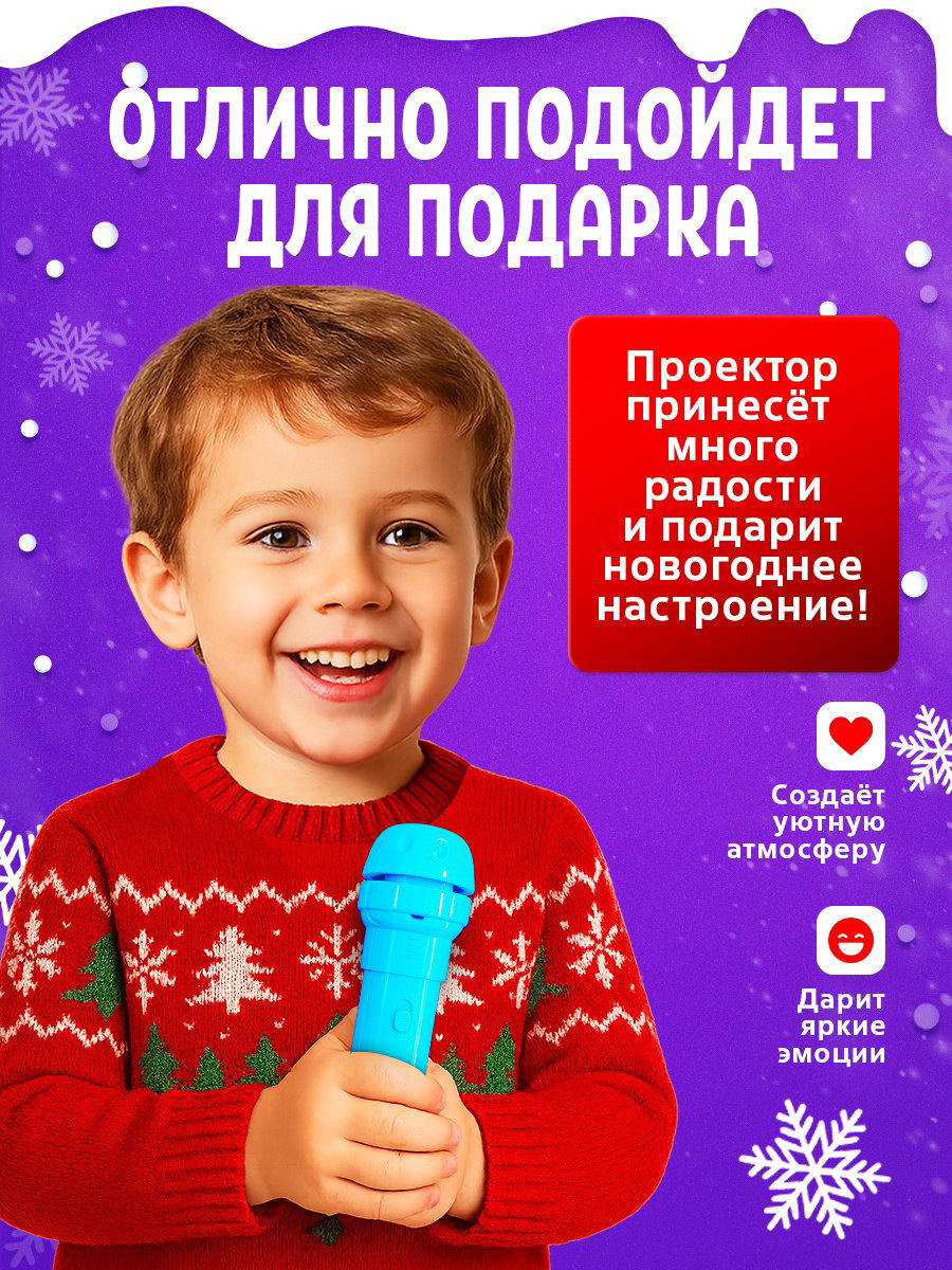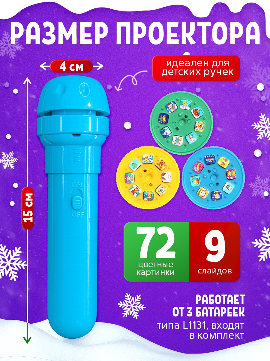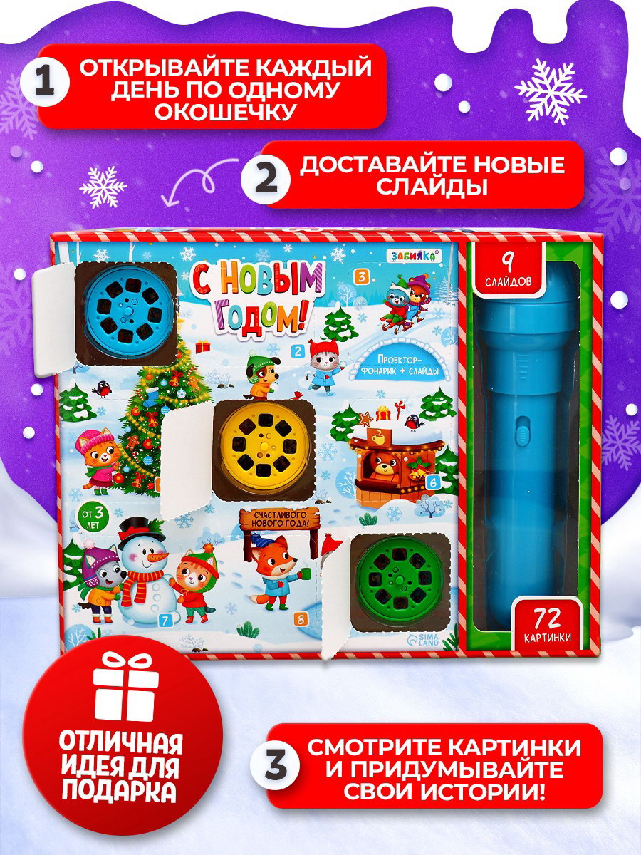 Тематика: Детская, Новогодняя Вид: Проектор, Фонарик Размер упаковки: 5.5 x 16 x 20.5 см. Типоразмер батареек: LR1130 Возраст: От 3 лет Дополнительные функции: Светящаяся Для кого: Унисекс Игрушка с видео: Да tnved: 9503007000 Тематика праздника: Новый год Адвент-календарь на 9 дней "Новогодний" то, что нужно для полезного и интересного досуга! Такой подарок поможет ребёнку скрасить ожидание Нового года, станет прекрасным началом для развития творческих способностей ребёнка. Открывайте каждый день по одному окошечку, доставайте новые слайды, смотрите картинки и придумывайте свои истории! С игрушкой ребёнок научится создавать изображения, потренирует воображение, мелкую моторику и абстрактное мышление. Особенности адвент-календаря