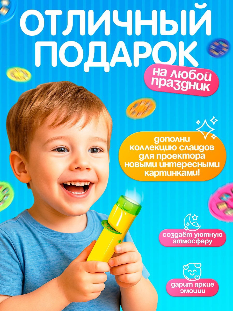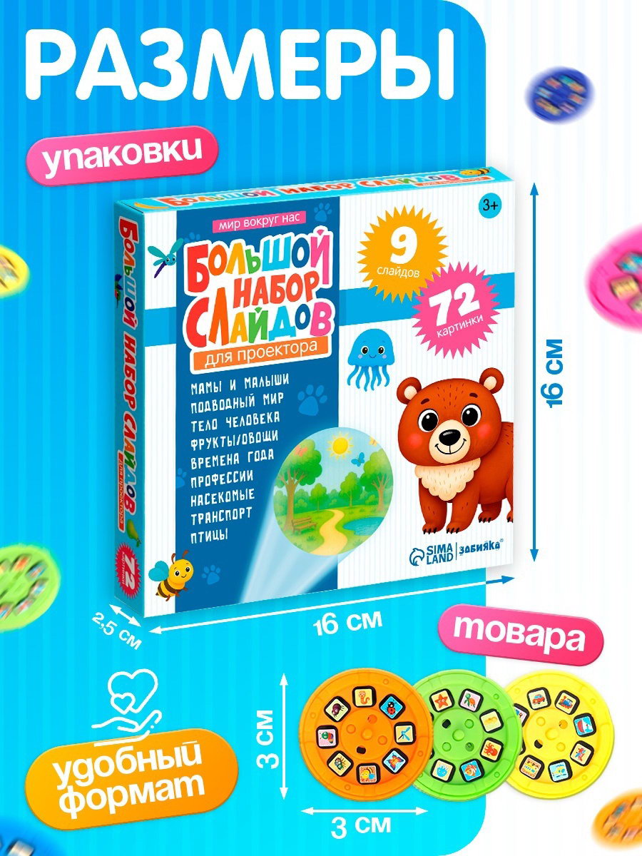 Размер упаковки: 2.5 x 16 x 16 см. tnved: 9503010000 Возраст: От 3 лет Набор: Да Дополнительные функции: Без функций Развитие навыков: Кругозор Тематика: Животный мир Для кого: Унисекс Большой набор слайдов для проектора "Мир вокруг нас" превращает обычный вечер дома в маленькое путешествие. Яркие проекционные картинки знакомят ребёнка с животными, природой, профессиями и транспортом, а родители могут придумывать по ним истории, сказки и развивающие задания. Формат "кино на стене" помогает удерживать внимание, мягко успокаивает перед сном и делает совместное время особенно тёплым. Особенности