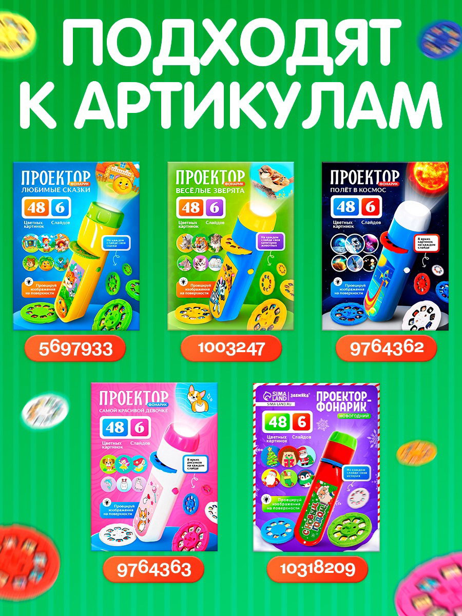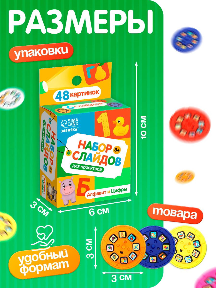 Слайды для проектора "Алфавит и цифры", набор, 6 слайдов, 48 картинок, 3x6x7 см., ZABIAKA, Китай