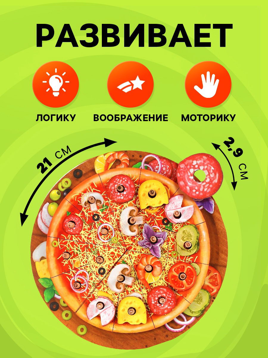 Возраст: Детский, От 3 лет Развитие навыков: Воображение, Моторика, Счёт Вид: Настольные, Форма, величина и цвет Размер упаковки: 21 x 3.5 x 21 см. Игрушка с видео: Да Особенности: В рамке Длина собранного пазла, см: 21 Ширина собранного пазла, см: 21 Тематика праздника: Универсальная тематика Тематика праздника: Универсальная тематика tnved: 9503006000 Температурное ограничение: Нет Цвет: Разноцветный Для кого: Унисекс Вид пирамидки: Логическая Жанр игры: Детская игра Тема обучения: Цифры, счёт, математика Вид головоломки: Пазлы и мозаика Количество элементов: 48 Тематика: Еда Тип пазлов: Головоломки Форма: Круг Сложность головоломки: 3 Уверяем, такого вы ещё не видели: пирамидка "Пицца"! Самая нижняя деталь - это поднос для пиццы, который разделён на несколько частей. Положив один кусок теста пиццы, скажите ребёнку, что это 1/6. Подобным способом объясните, что такое 1/3, 1/2. Второсй слой - соус. Отверстия в деталях нужно совместить со штырьками. Привычный принцип сбора пирамидки усложняется за счёт совмещения трёх отверстий. Каждый кусочек третьего слоя пиццы (сыр и начинка) разделён ещё на три части. Чтобы составить цельный кусок, необходимо собрать три детали. Теперь вы можете размещать отдельные детали начинки: грибы, помидоры и пр. Попросите ребёнка назвать каждую деталь и посчитать количество. | ||